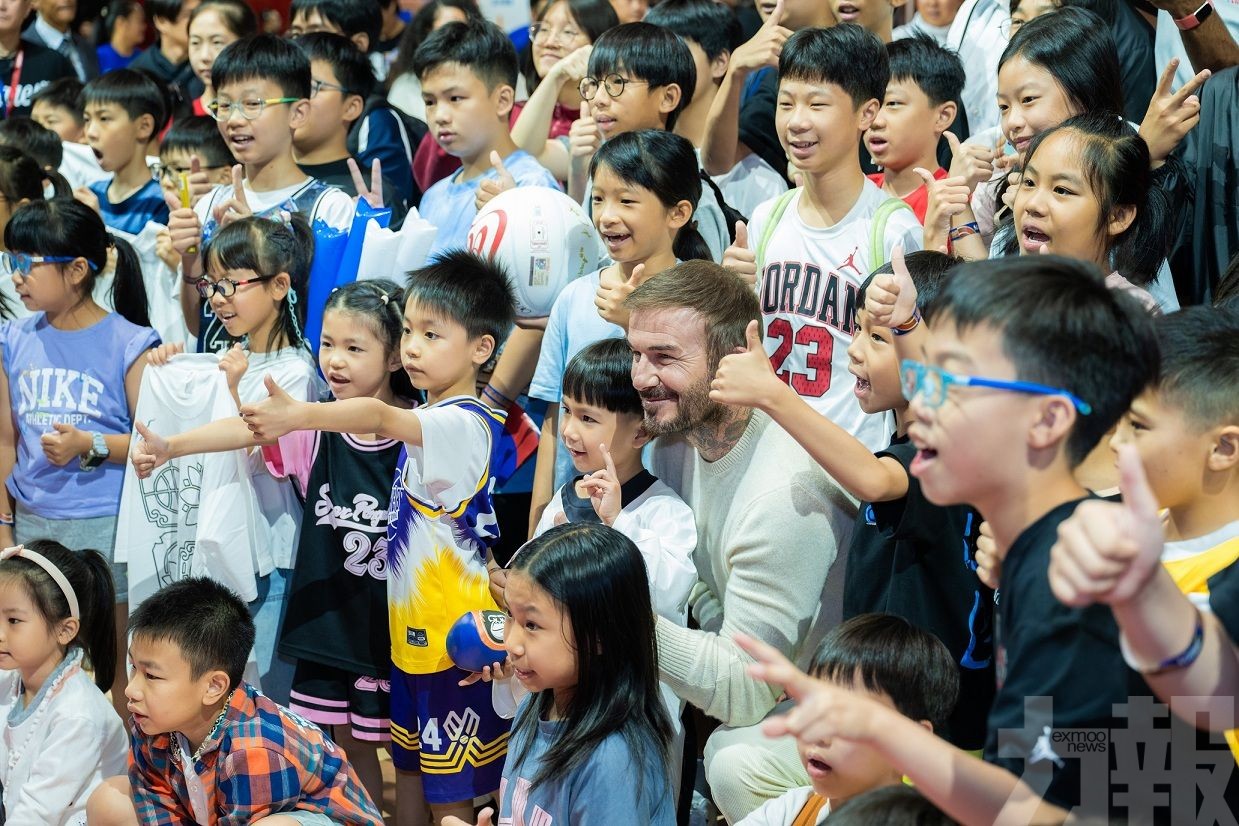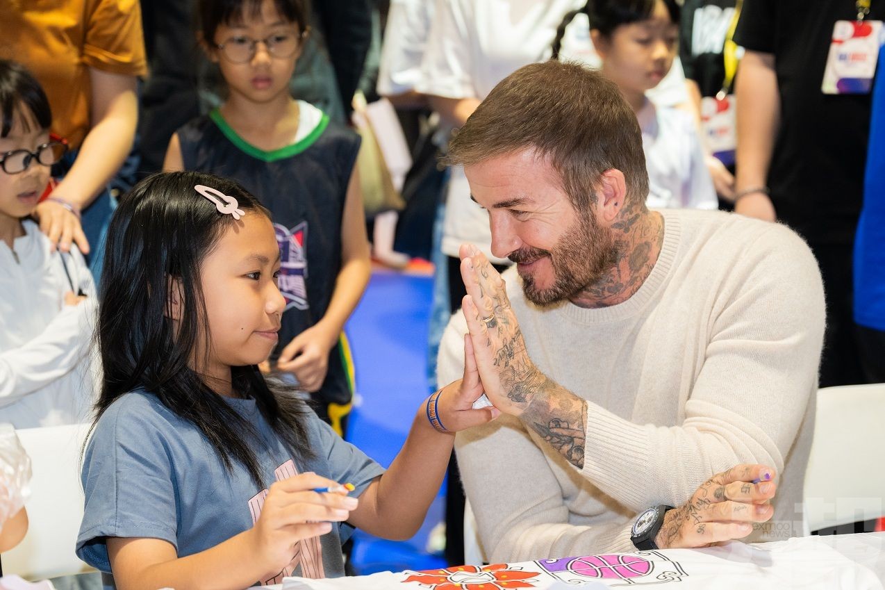 (金沙全球大使大衛‧碧咸周六現身支持「NBA關懷行動x金沙關懷籃球公益周」系列活動──籃球社區嘉年華,與小朋友製作手繪T裇,其樂融融。)