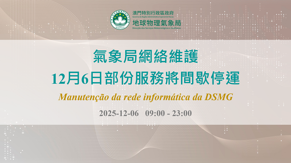 【澳門日報消息】氣象局訊:地球物理氣象局網絡系統將於12月6日(星期六)上午9時至晚上11時網絡維護,期間部分對外資訊將會出現間歇性延遲,1311電話系統查詢服務將間歇性停運,籲市民留意。待維護工作完成後,隨即恢復運作。