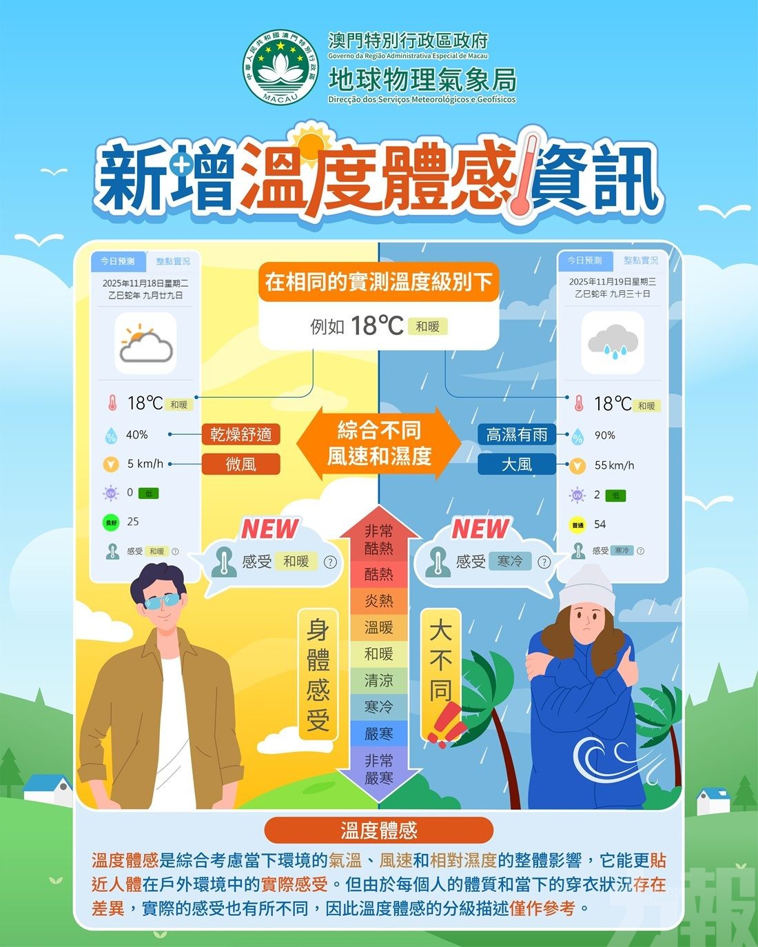 「溫度體感」將為市民提供更貼近實際感受的實時氣象資訊。該資訊結合實時氣溫、濕度、風速等氣象要素,計算出當刻天氣狀況下,一般人在戶外環境中較常出現的實際感受,並據此調整衣著及活動安排。無論是日常出行、戶外工作或休閒活動,市民均可透過此資訊獲得更實用的氣象參考,進一步提升生活品質。