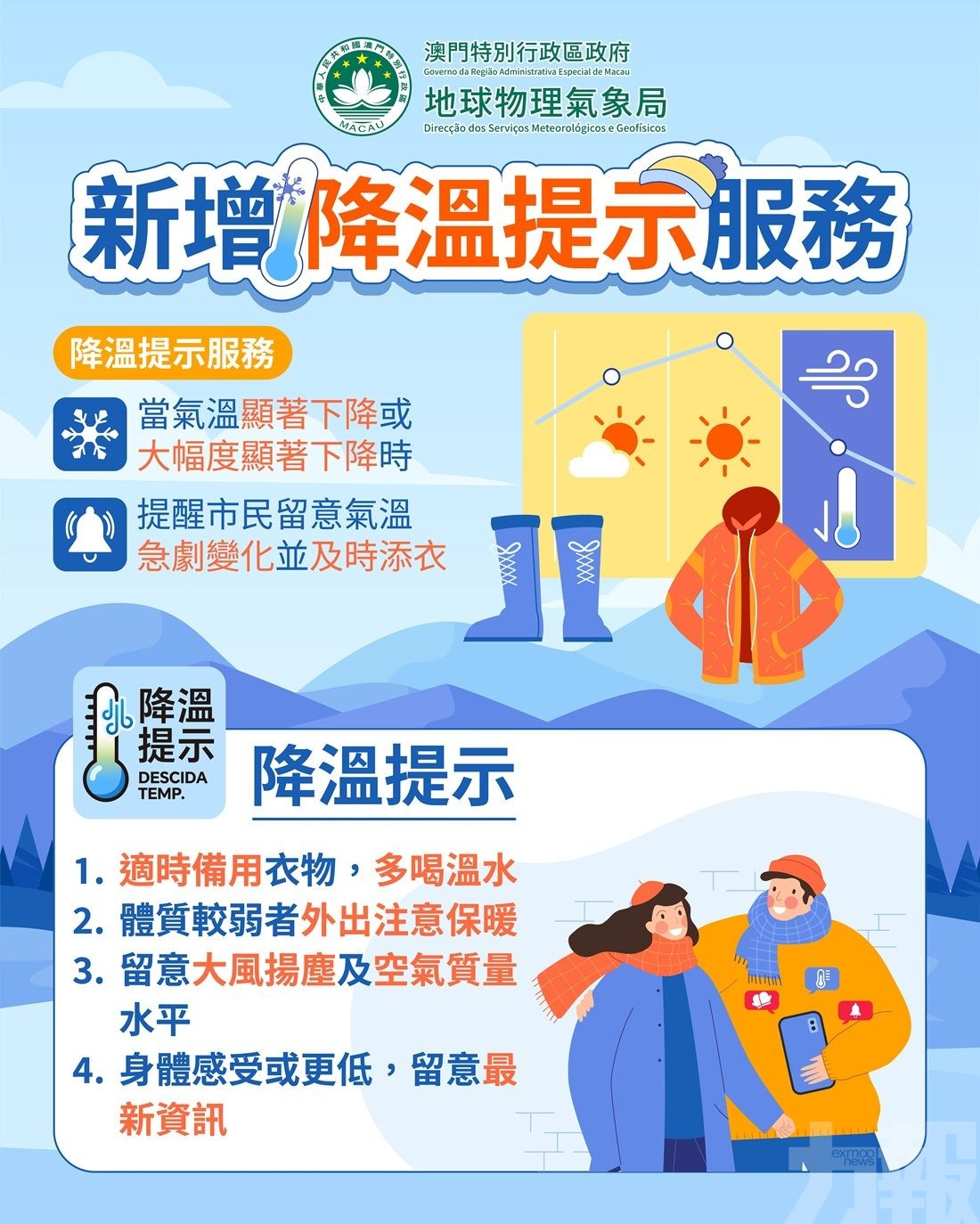 「降溫提示」主要針對本澳秋冬季的氣候特點,當預測氣溫顯著或大幅顯著下降時,氣象局將提前發出降溫提示,為市民提供更豐富多元和及時的氣象資訊,讓公眾能提前採取適當預防措施,減少顯著降溫天氣對健康造成的影響。