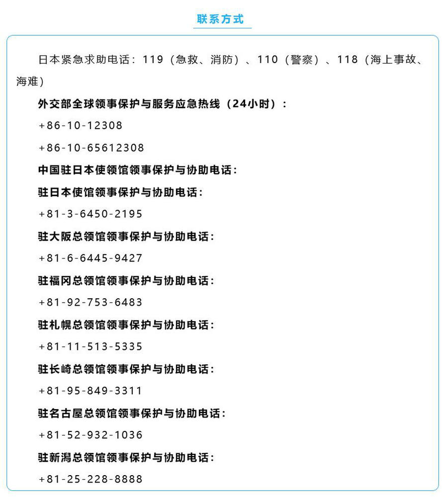 外交部和中國駐日本使領館提醒中國公民近期避免前往日本,在日同胞密切關注地震及次生災害預警信息,遵循當地避難指令,加強自身安全防範,遠離海邊等高風險地區。如遇緊急情況,及時報警並聯繫駐日使領館尋求協助。