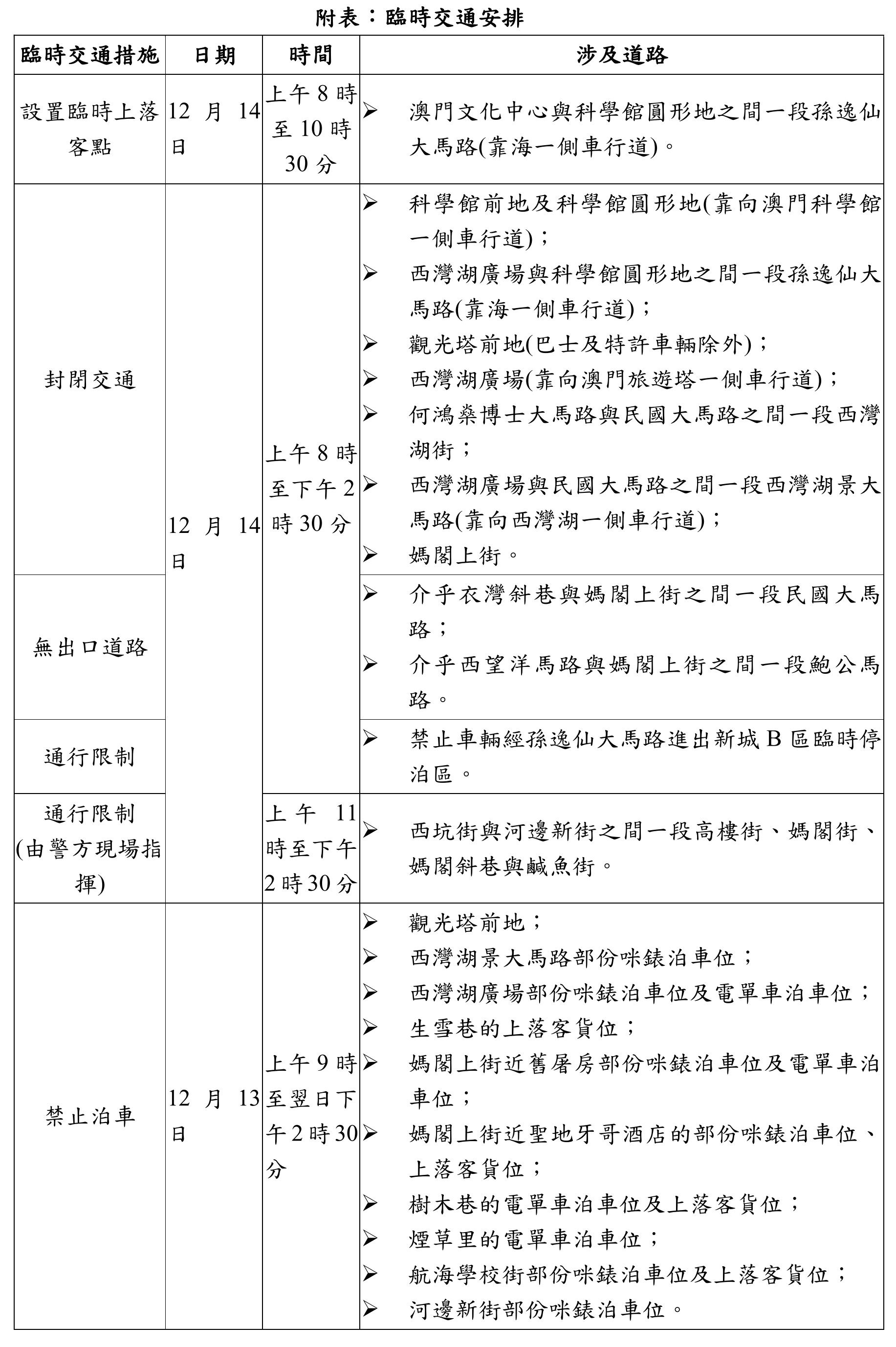【澳門日報消息】交通事務局訊:配合澳門日報讀者公益基金會舉辦“公益金百萬行”活動,本月14日上午8時至下午2時30分,澳門孫逸仙大馬路、西灣湖廣場、西灣湖景大馬路、媽閣上街至媽閣廟前地一帶道路實施多項臨時交通管制,新城B區臨時停泊區暫停車輛進出,同時,多個巴士站臨時停用,多條巴士路線需改道行駛並調整停靠站點。有關臨時交通安排詳情可參閱附表,而相關巴士服務調整則可查閱澳巴及新福利網頁。 交通事務局呼籲參與活動人士盡量使用公共交通工具,而為應對百萬行活動期間的人流及車流,交通局已協調兩間巴士公司及輕軌公司作適當安排;當中,兩巴將增加媽閣周邊的巴士路線班次,並於媽閣交通樞紐站及周邊位置派駐人員指引乘客;同時,輕軌亦將加強運營服務及加密班次,輕軌媽閣站會因應人流實施人流管控安排,敬請乘客留意車站廣播,遵從站內標識及聽從車站工作人員的指示,有序乘車。