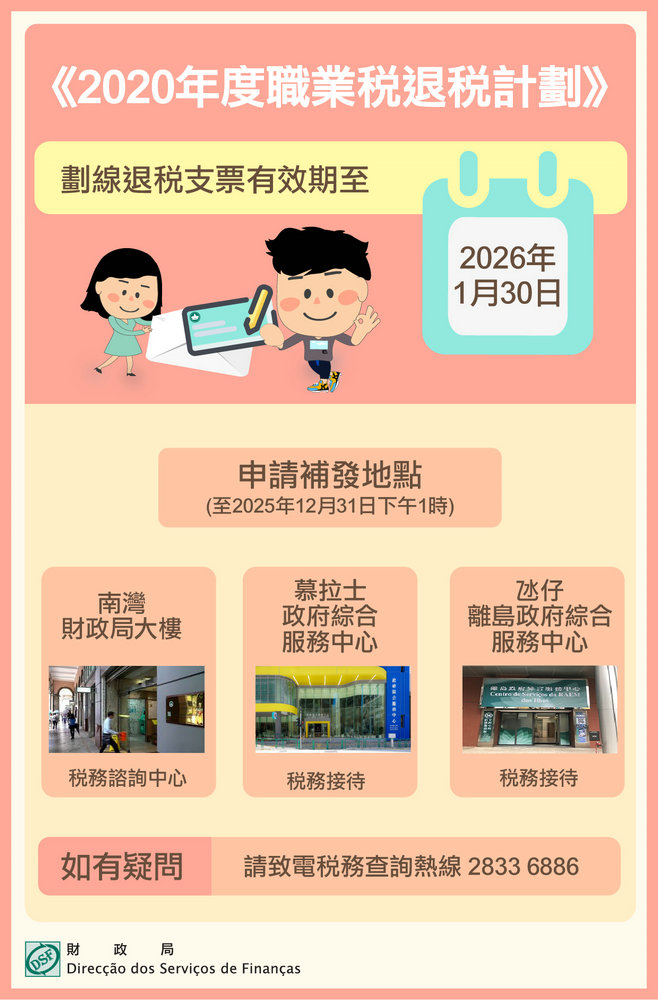 另外,補發上述劃線退稅支票的申請期限至2025年12月31日止,鑒於該日公共部門獲豁免下午上班,僅提供對外服務至當日下午一時,倘需要申請補發退稅支票的納稅人,應盡快在上述限期前前往財政局三個服務地點接待櫃位提交補發支票申請表:(1)南灣財政局大樓地下稅務諮詢中心、(2)慕拉士政府綜合服務中心——稅務接待、(3)氹仔離島政府綜合服務中心——稅務接待,逾期提交補發支票申請表將無法受理。