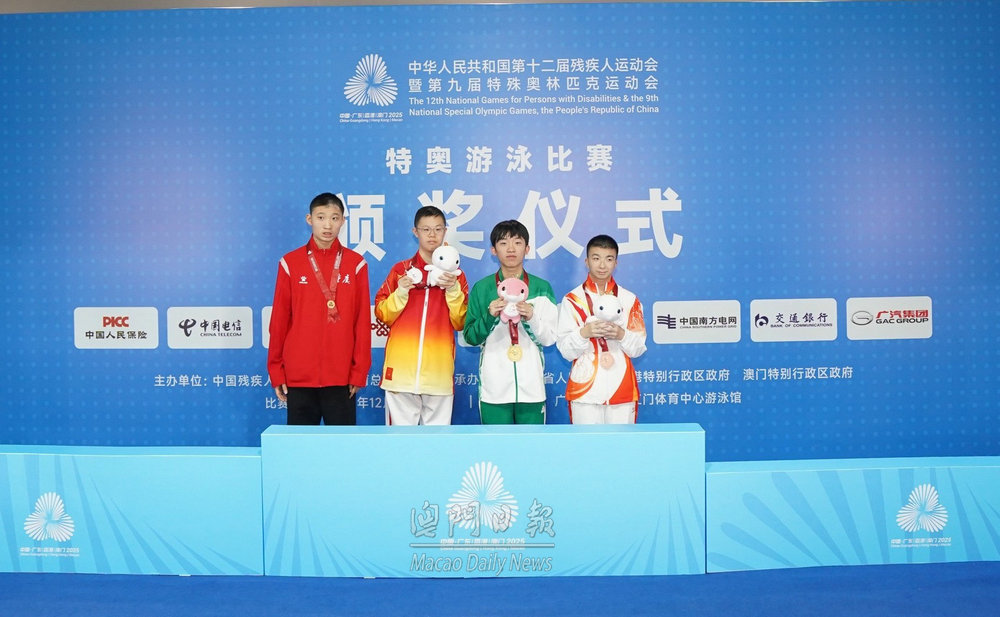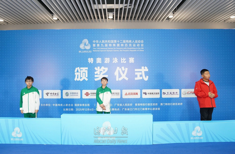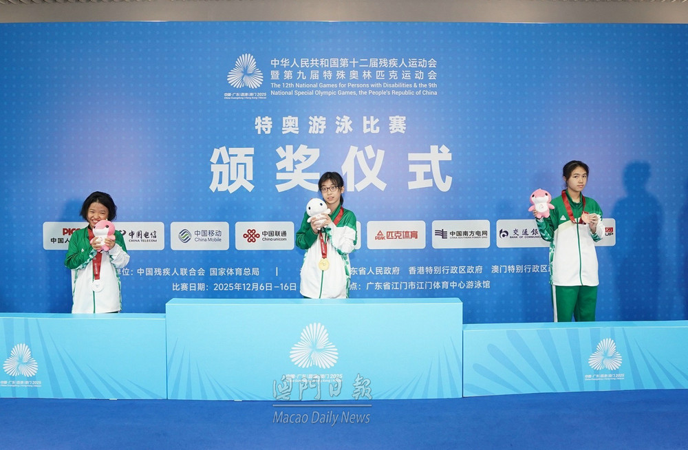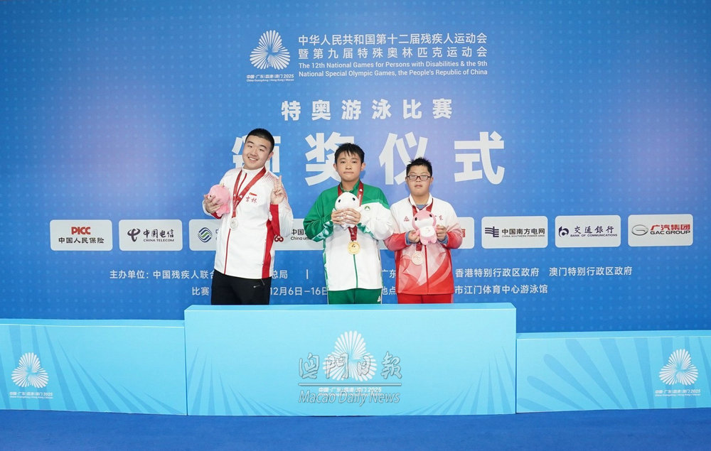 【澳門日報消息】第九屆特殊奧林匹克運動會游泳比賽今日上午繼續在廣東江門體育中心游泳館舉行。澳門代表隊在50米仰泳和200米自由泳項目上再有亮眼表現,在男女各年齡段組別中捷報頻傳,共獲四金六銀五銅佳績。 50米仰泳項目中,8歲至11歲低齡組,黃灝銘、郭景駿包攬男子一組金銀牌,孔家慧、呂筱悠分獲女子一組銀銅牌。12至15歲組,劉璟雯、袁子瑜、陳優悅包攬女子一組金銀銅牌,吳宇恒獲男子二組金牌,談天佑獲男子一組銀牌。16至21歲組,杜敏莉獲女子一組銀牌。 200米自由泳項目中,12至15歲組吳君陽獲男子二組金牌,王健、張浚浩分獲男子一組銀銅牌。16至21歲組,梁偉駿獲男子一組銅牌。22至29歲組,湯文昊獲男子一組銅牌。 截至今日上午,澳門代表隊在特奧游泳賽場已獲九金十四銀九銅。