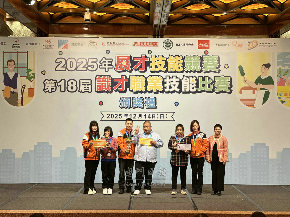 【澳門日報消息】特奧會主辦“第18屆識才職業技能比賽暨2025年展才技能競賽”頒獎禮,今日下午三時假澳門美高梅大宴會廳舉行,共56名特殊人士和8名義工獲獎。