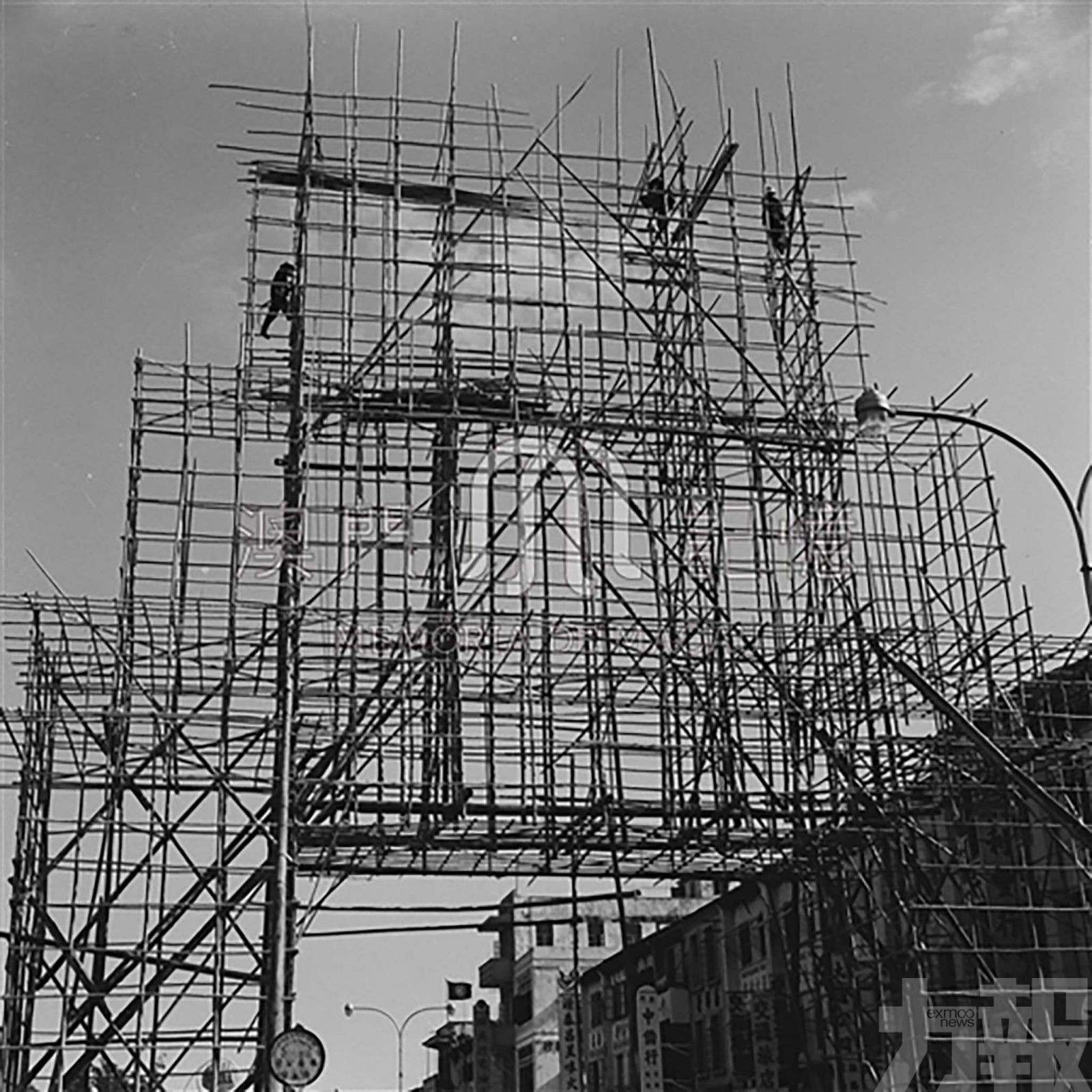 1950年代,工匠利用竹棚搭建國慶牌樓。(澳門美術協會提供,摘自「 澳門記憶 」文史網)