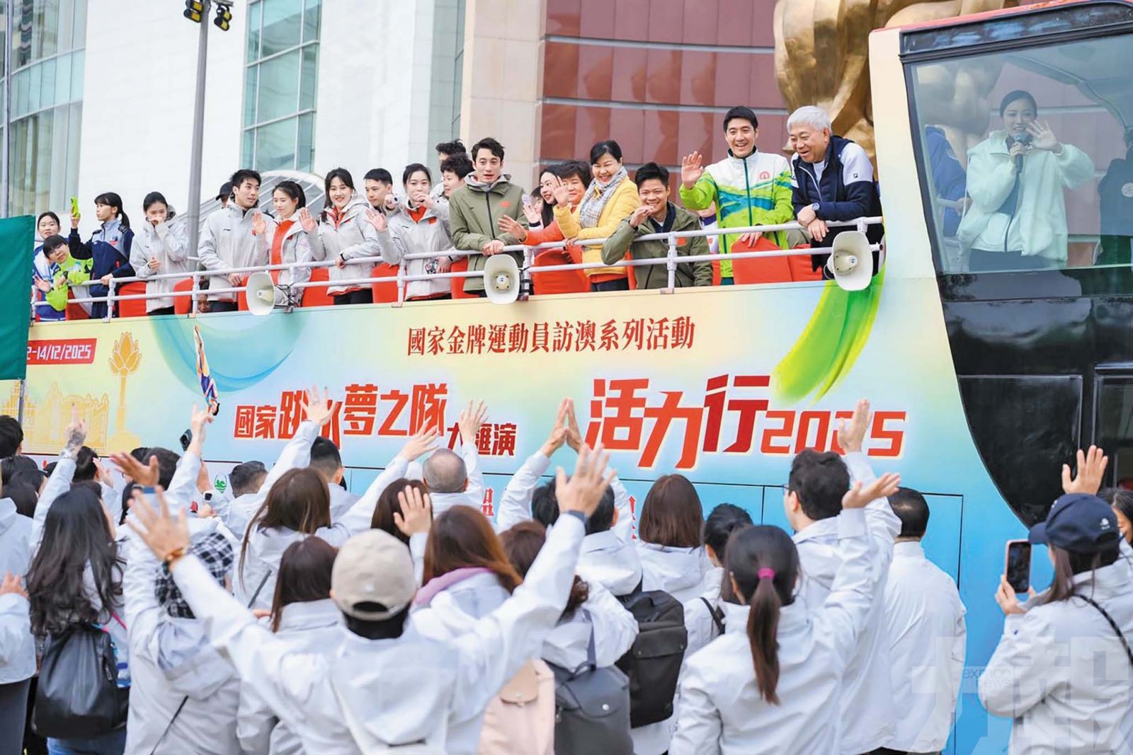 為慶祝中華人民共和國成立七十六周年及澳門特別行政區回歸祖國廿六周年,中國澳門體育暨奧林匹克委員會、澳門特區政府體育局及澳區省級政協委員聯誼會聯合主辦、中國澳門游泳總會協辦及銀河娛樂集團(銀娛)冠名贊助之「國家金牌運動員訪澳系列活動 — 國家跳水夢之隊大匯演X活力行2025」圓滿結束一連三天的互動交流活動。國家跳水隊聯同特邀嘉賓昨(14)日現身「第42屆公益金百萬行」,在開蓬巴士上為參與者打氣,為熱鬧的年度慈善活動增添氣氛。