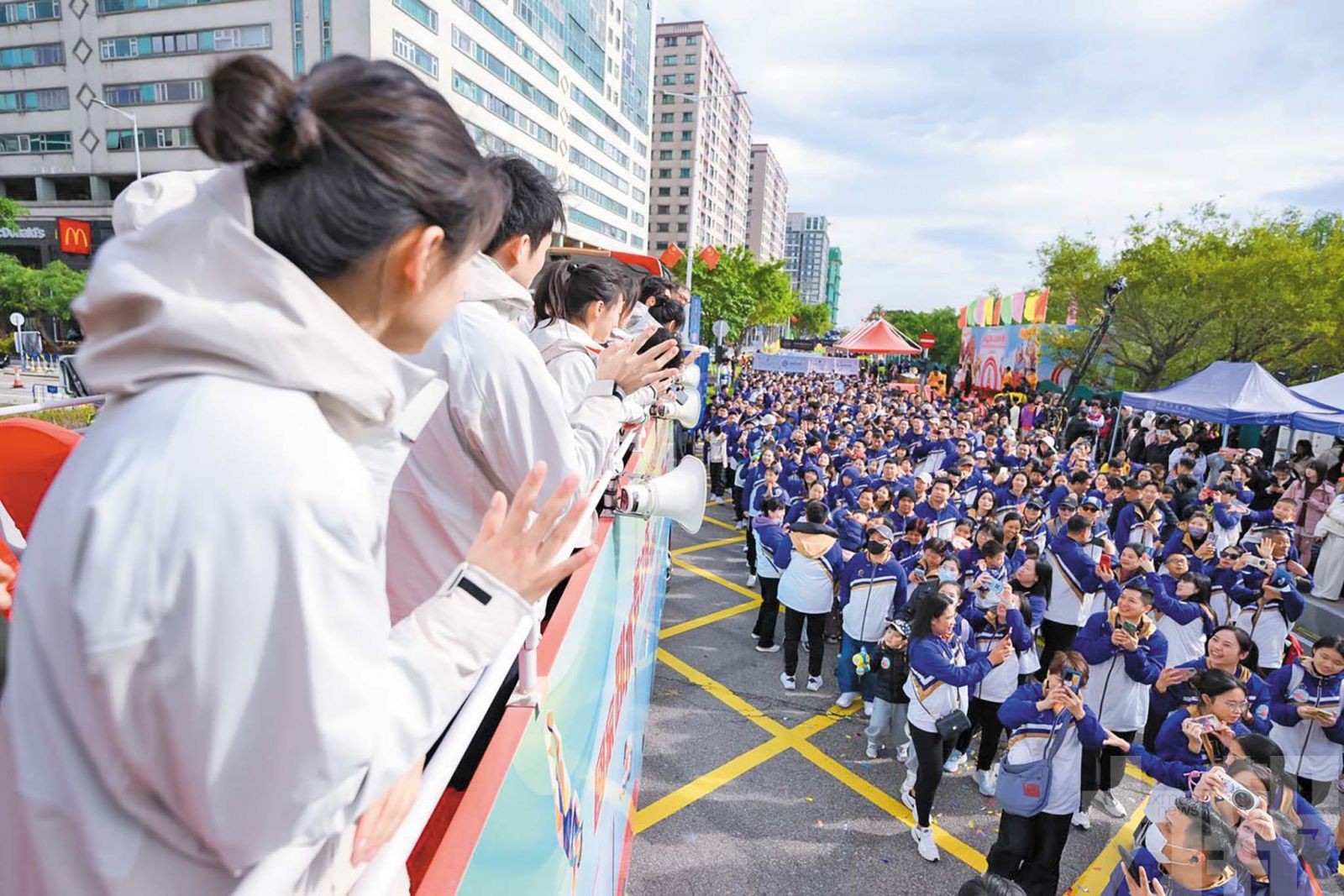 據悉,「國家金牌運動員訪澳系列活動X活力行2025」今年一如既往繼續支持及助力公益金百萬行。澳區省級政協委員聯誼會會長馬志成、中國澳門體育暨奧林匹克委員會理事會主席陳澤武,以及冠名贊助單位銀河娛樂集團主席呂耀東、企業事務董事林志成出席;與國家跳水隊領隊周繼紅、教練陳若琳、奧運金牌得主陳芋汐、昌雅妮、陳藝文、練俊傑、王宗源,以及掌敏潔、盧為、陳佳、林珊、鄭九源、胡宇康、朱子鋒、白鈺鳴等世界冠軍,以及“星級”特邀嘉賓蘇炳添、吳敏霞、李小鵬、李珊珊、何冲,還邀請了澳門運動員方文浩、鄭沘珞、陳珮琳、吳致軒等一同登上開蓬巴士,先後在觀音像和科學館附近停留,向途經的社會各界團體及參與者揮手致意,送上鼓勵和祝福。市民及參與者沿途熱情回應,吸引不少人拍照留念。