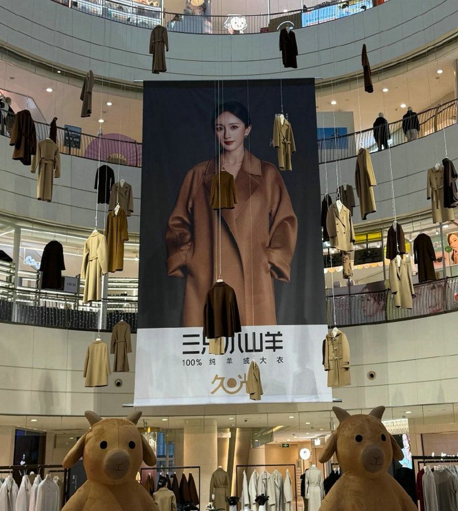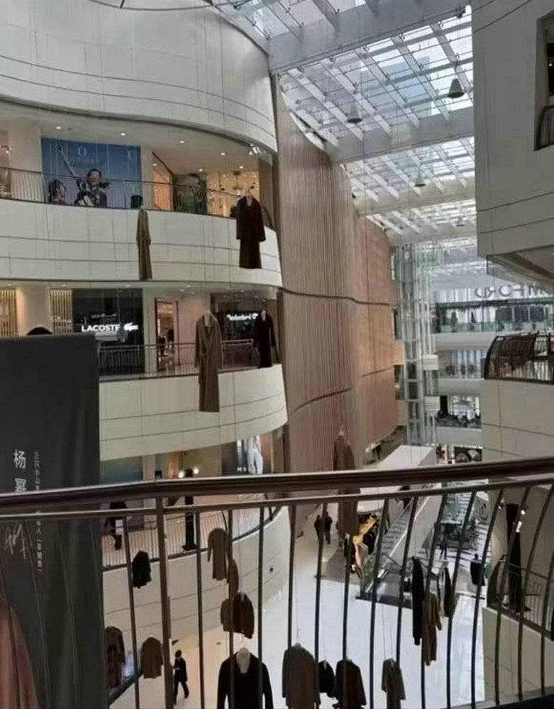 網片顯示,相關大衣懸掛高度不一,錯落分佈在商場的整個中庭空間,中間是品牌代言人的巨幅海報。此舉是商場四樓“三隻小山羊”品牌新店開業的宣傳佈置,商場工作人員日前受訪表示,此前已接到多名顧客投訴,反映大衣展覽形式觀感不佳,但由於商場與品牌方的合作周期存在限制,暫時無法提前撤下該佈置。