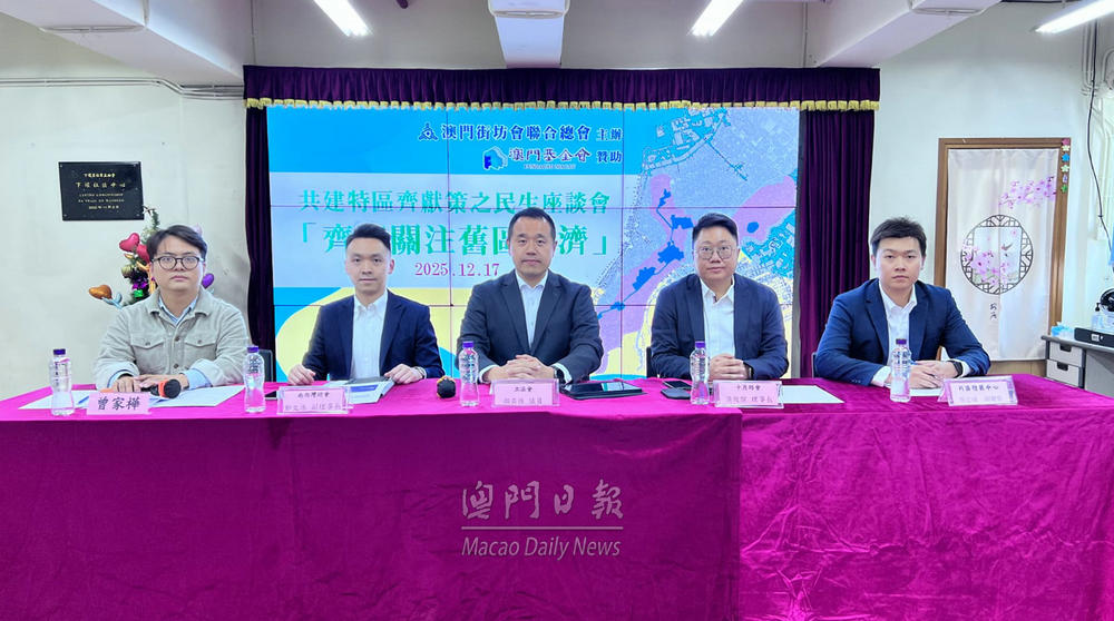【澳門日報消息】街總南區辦事處今日下午三時在下環社區中心舉辦“齊齊關注舊區經濟”民生座談會,立法議員顏奕恆、十月坊會理事長梁俊傑、南西灣坊會副理事長鄭文浩、片區發展中心副總監蔡志成等出席並發言,街總南區辦事處主任曾家樺主持,就舊區活化的機遇、挑戰與具體路徑深入探討,旨在凝聚共識,推動社區經濟提質發展。