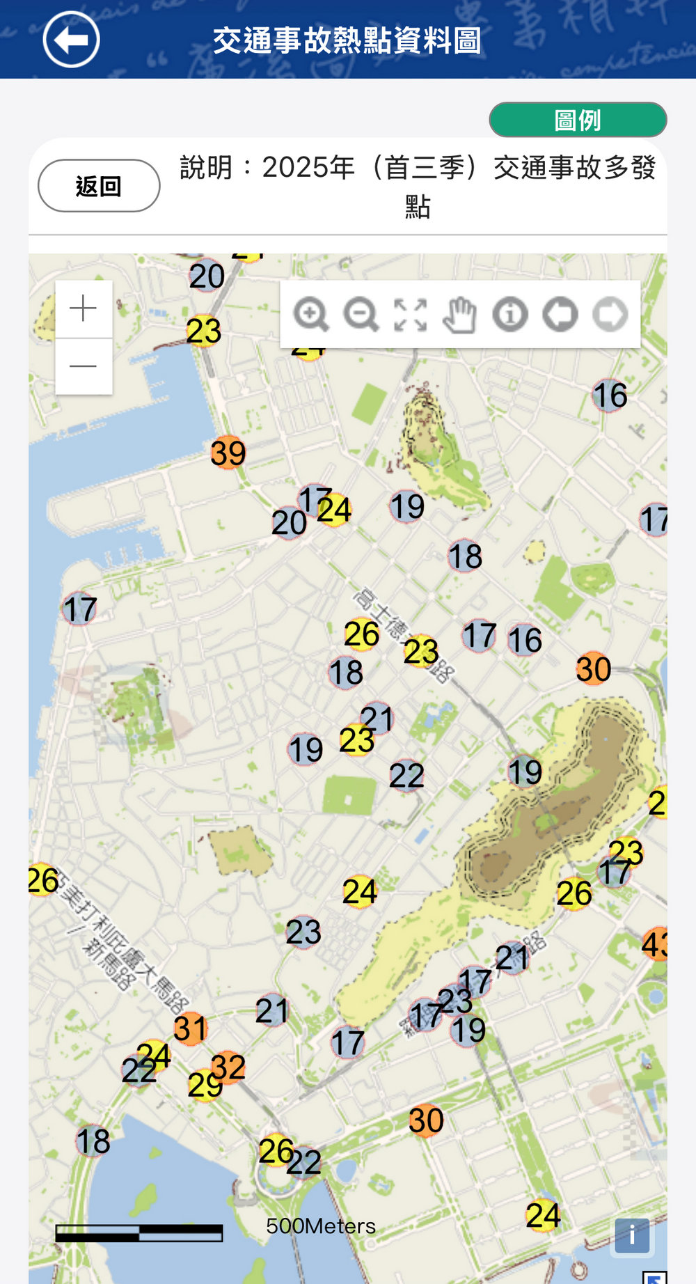 【澳門日報消息】治安警察局與保安部隊事務局合作開發“交通事故熱點資料圖”,今日上線。可透過治安警官方網站或更新至最新版警務易手機應用程式查看,數據每季度更新。 有駕駛者認同多渠道了解本澳交通資訊是好事,認為駕駛期間無論是否經過交通黑點都保持警覺,人車禮讓,安全行車。當局期望道路使用者關注交通事故資訊,強化出行安全意識。 交通事故熱點資料圖在地圖上整合顯示半徑五十米範圍內交通事故次數較高的地點,並以不同顏色表示交通事故發生數量及傷亡事故,其中黑色圓圈表示涉及死亡事故,紅色圓圈表示該範圍受傷事故“較多”;以事故數量劃分,橙色圓圈表示該範圍事故發生“最頻繁”,黃色圓圈表示該範圍事故發生“頻繁”,藍色圓圈表示該範圍事故發生“較多”。使用方式與澳門地圖通大致相同,當點擊地圖上顏色圓圈,會顯示事故宗數、涉及車輛數量、傷亡人數及事故成因等數據。