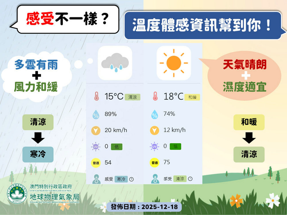 【澳門日報消息】氣象局訊:慶回歸,迎冬至,賀聖誕,長假期安排活動出行,天氣狀況至關重要。 回歸日轉晴 受一股偏東氣流影響,今日(18日)晚間漸轉多雲,明日(19日)至回歸日(20日)初時有幾陣雨,但隨著偏東氣流減弱,日間將會漸見陽光,冬至日天氣亦會較和暖,日夜溫差較大。 聖誕後降溫 下周初受東北季風影響,氣溫會略降,早晚天氣較涼;而日間有陽光下,展望長假期(20日至25日)整體氣溫感覺較和暖,聖誕過後東北季風會再度增強,氣溫將會下降。 推溫度體感 明明顯示同樣的溫度,但有時覺得溫暖舒適,有時又覺得寒氣逼人?這是由於不同濕度及風速會令人體感受到的冷暖程度與環境的溫度有所不同。為此,氣象局近期推出了“溫度體感”資訊,可讓市民掌握更貼近身體感受的實時氣象資訊。 未來,氣象局將致力提供更豐富、更多元化、更貼近生活的氣象資訊,可關注氣象局微信官方賬號“澳門天氣”以獲取最新天氣資訊。
