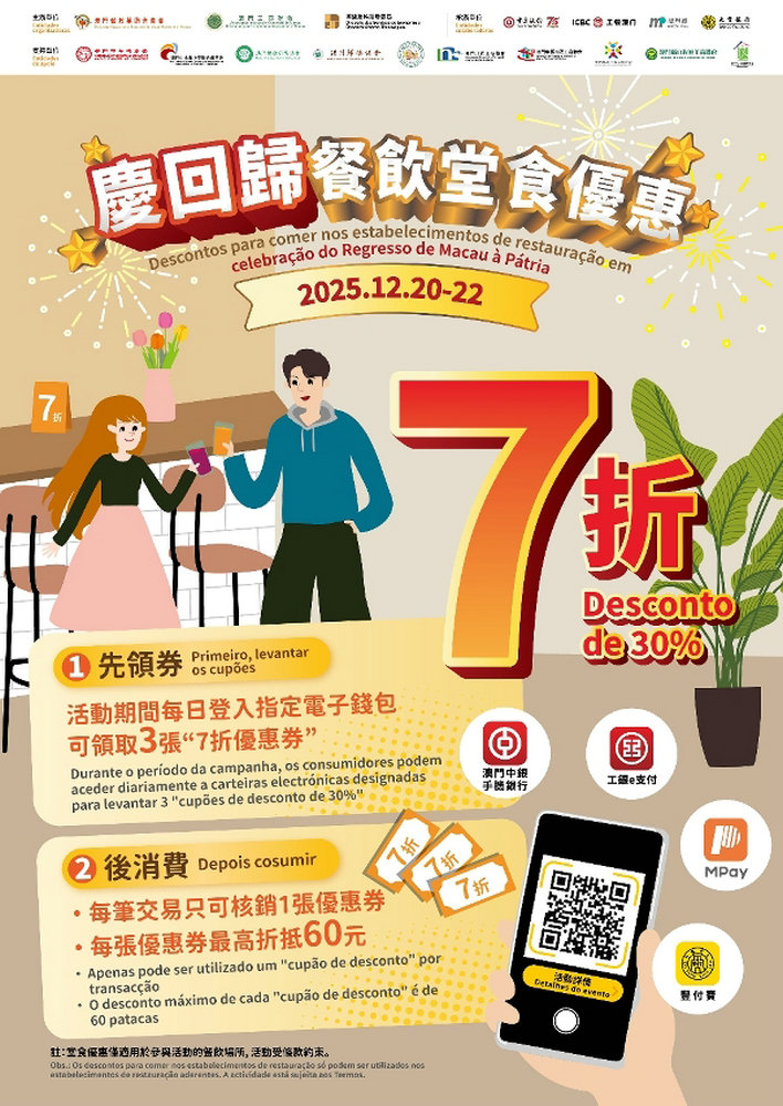 【慶回歸】五百店堂食七折優惠三日 四男女策劃人體藏毒 警檢值百萬冰毒 高利亞馬路下周一可轉入慕拉士前地 海關截四偷渡船拘八人 男子攜卅三萬六港鈔青茂被截