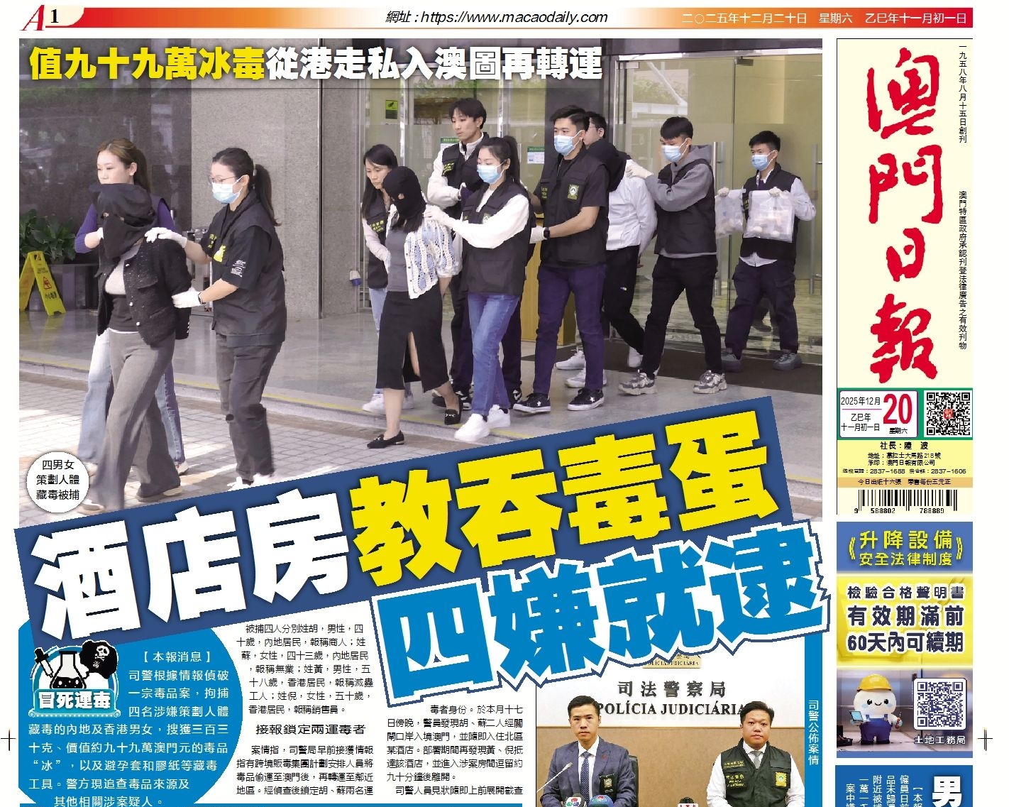 【澳聞頭條】酒店房教吞毒蛋四嫌就逮 【要聞頭條】我代表連提三個“決不允許” 【經濟頭條】商界:資源整合+創新營銷 活化片區 【體育頭條】阿仙奴“愛”作戰