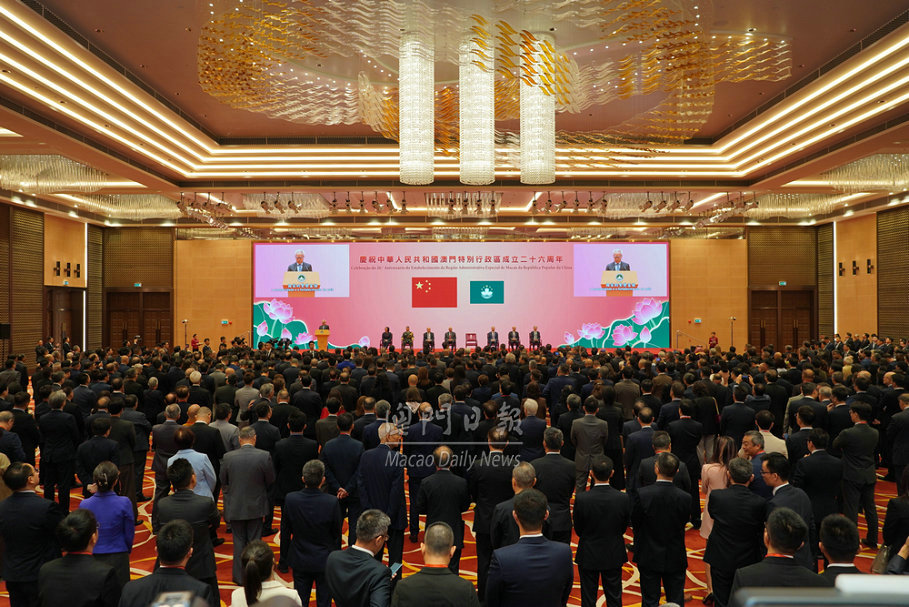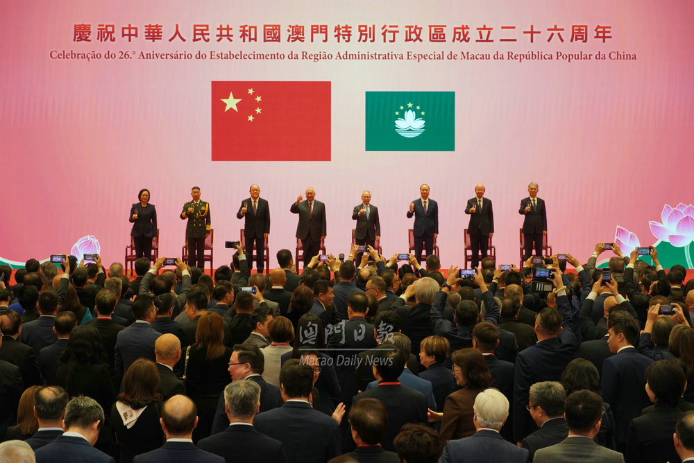 【澳門日報消息】今日是特區成立26周年,慶祝澳門特區成立26周年招待酒會今日上午9時30分在中國與葡語國家商貿合作服務平台綜合體舉行。 行政長官岑浩輝、全國政協副主席何厚鏵、中聯辦主任鄭新聰、前任行政長官賀一誠、外交部駐澳門特派員公署特派員劉顯法、解放軍駐澳門部隊司令員于長江、立法會主席張永春、終審法院院長宋敏莉,聯同特區政府新一屆主要官員以及各界人士出席。