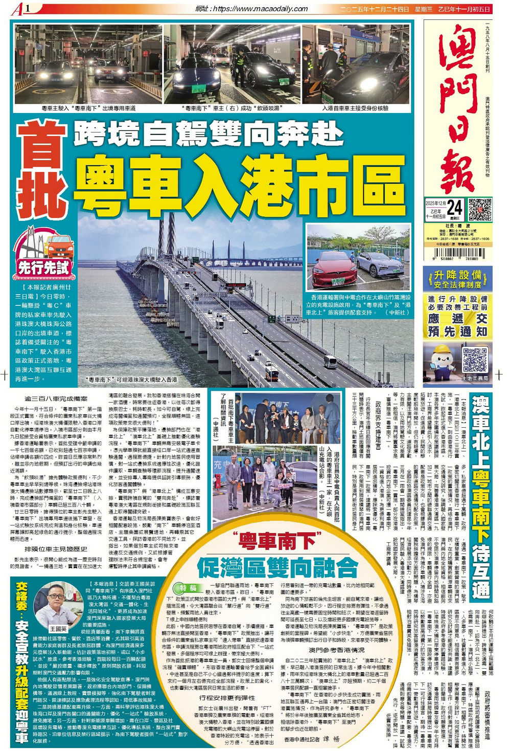 【澳聞頭條】首批粵車入港市區 【要聞頭條】華:反對無理打壓中企 【經濟頭條】年尾客流升溫 聖誕酒店房滿九成 【體育頭條】拿坡里捧意超盃