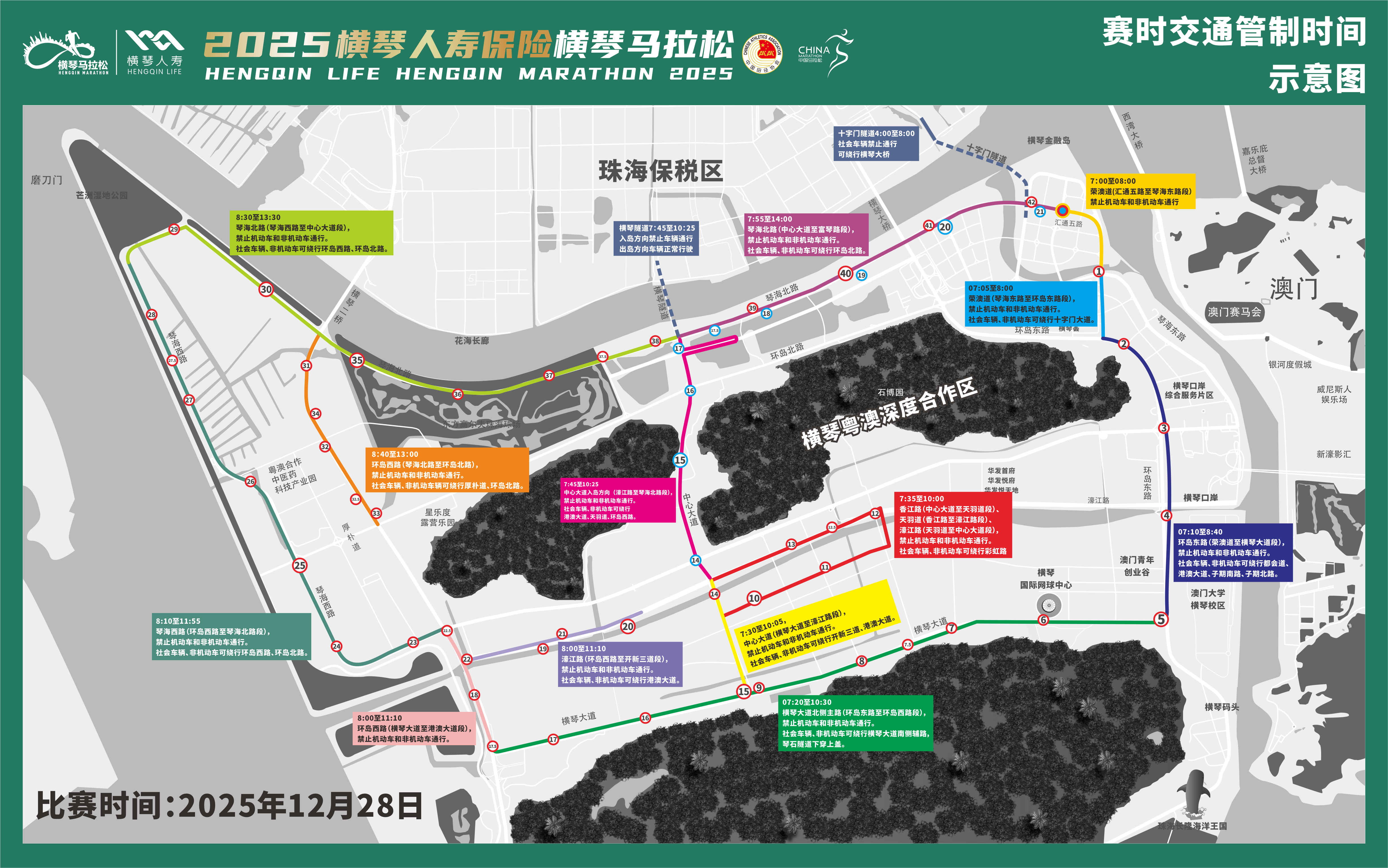 【澳門日報消息】2025橫琴馬拉松比賽定於星期日(28日)在橫琴粵澳深度合作區舉行,起終點設在橫琴金融島中央公園。珠海交警表示,比賽期間將對部分道路分時、分段採取臨時交通管制措施,具體安排如下:
