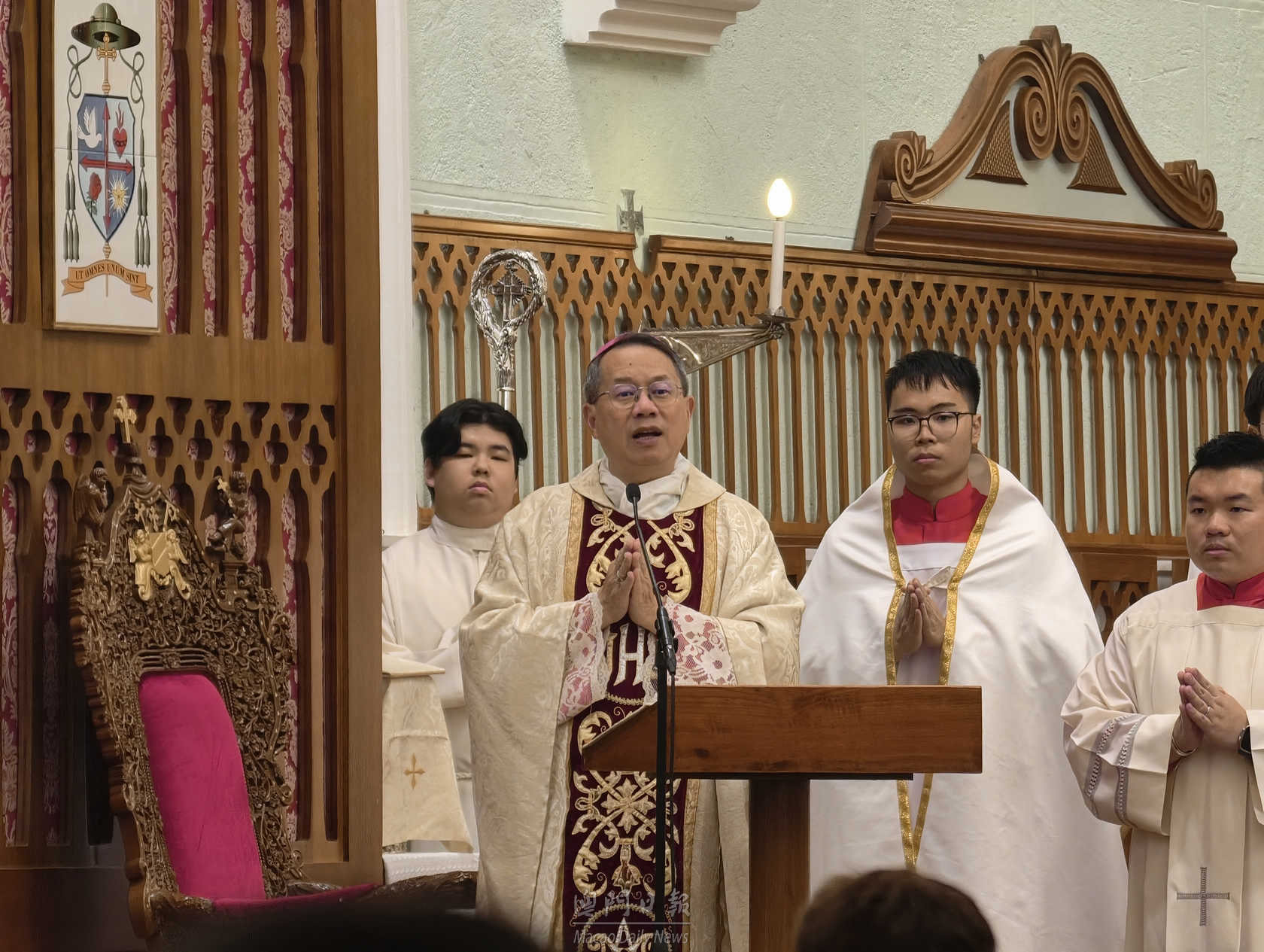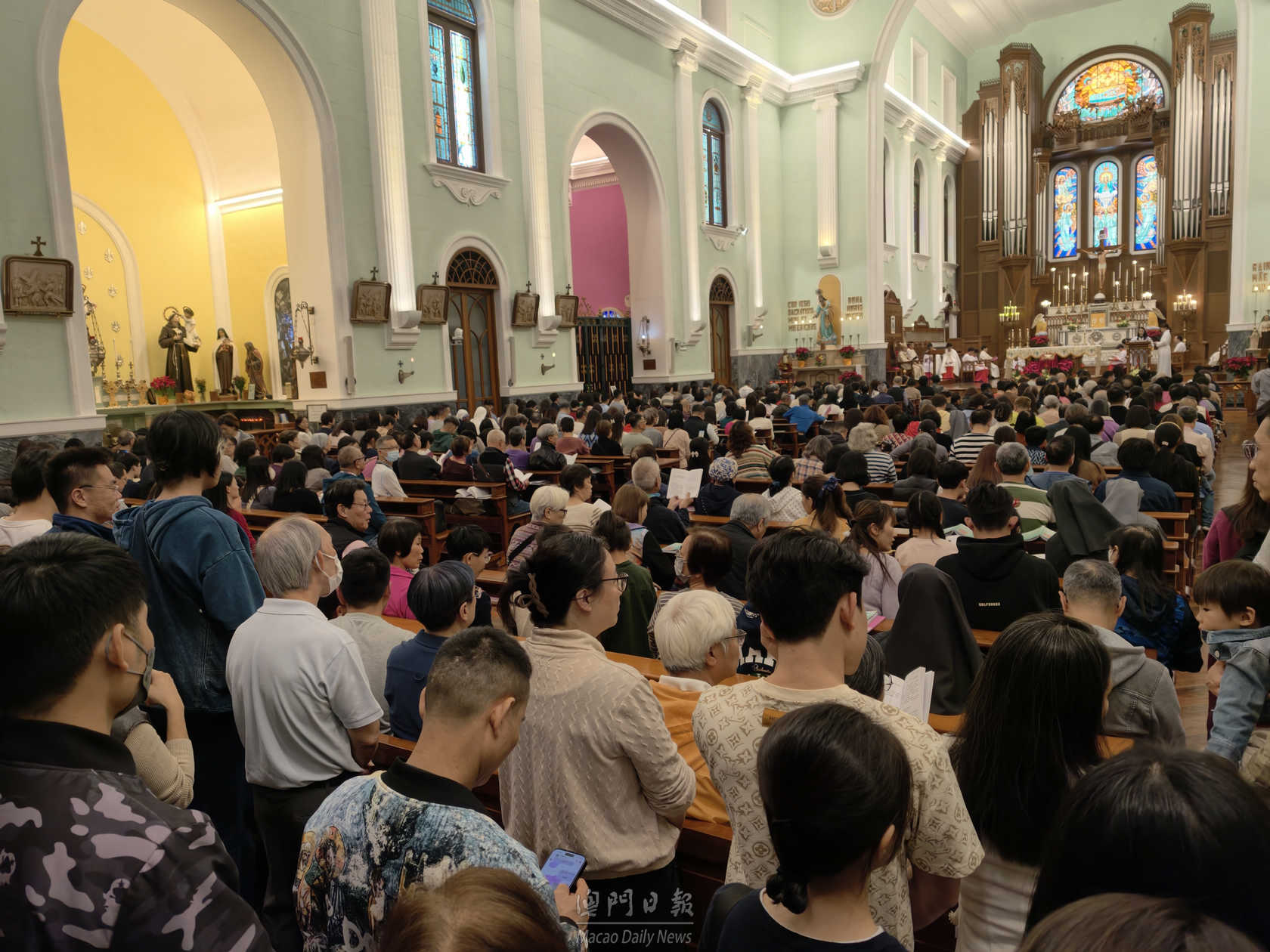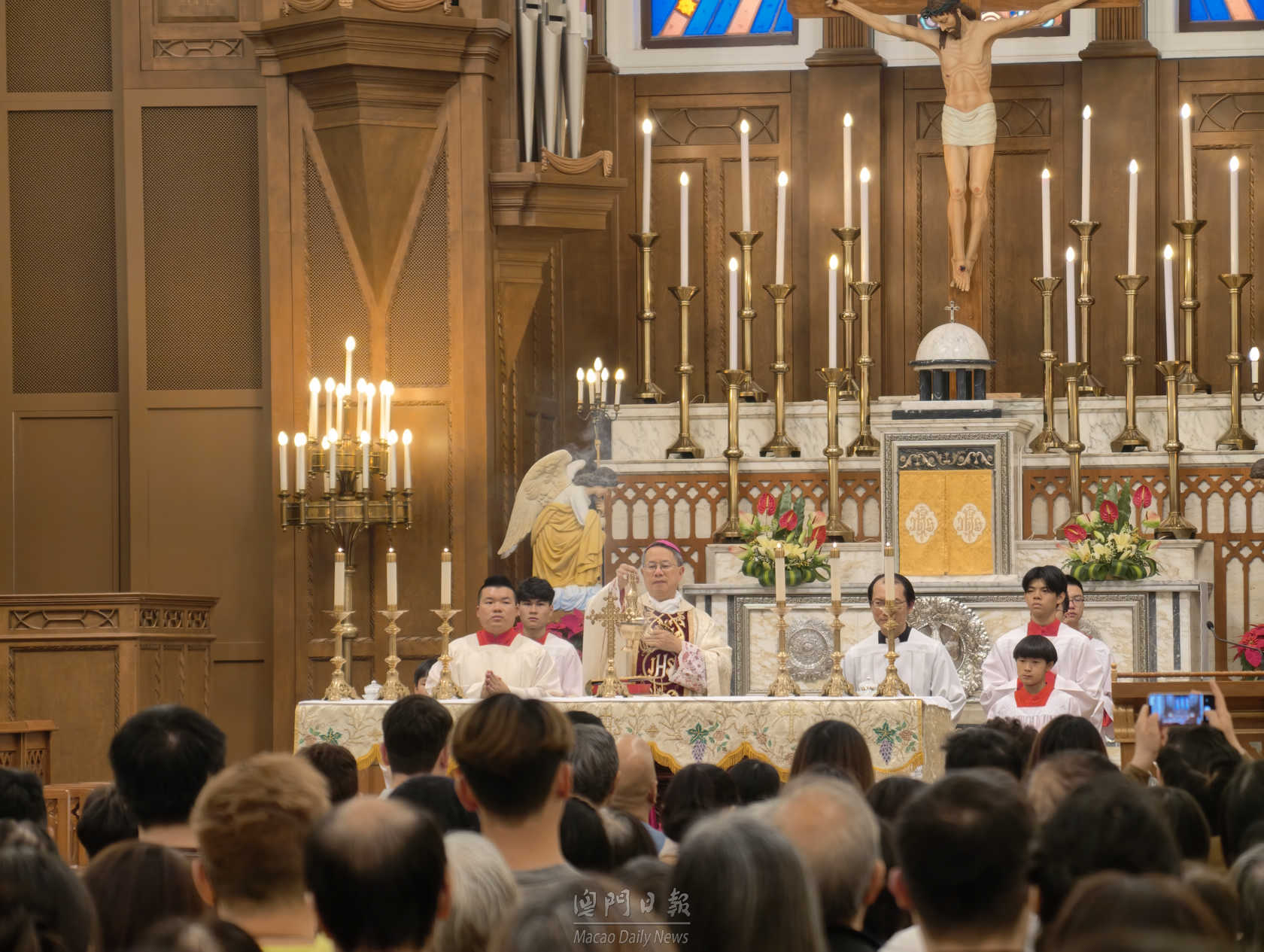【澳門日報消息】本澳天主教各堂區在平安夜晚上舉行子夜彌撒,迎接一年一度聖誕節。主教座堂於今晚九時半舉行粵語彌撒儀式,由澳門教區主教李斌生主持。大批教徒、居民及遊客出席,氣氛莊嚴肅穆。