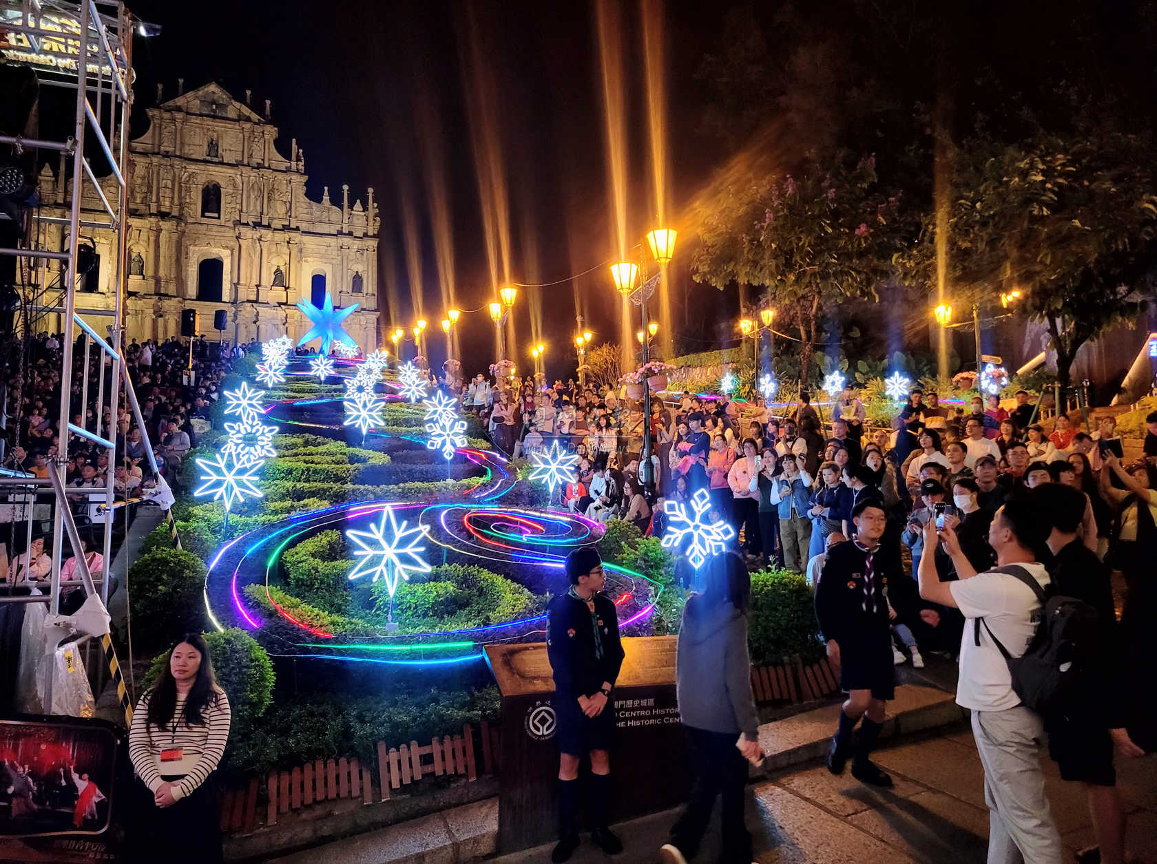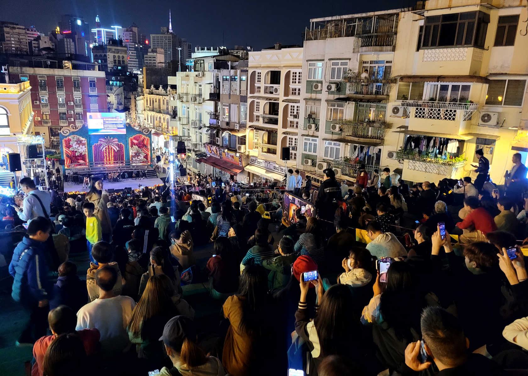 【澳門日報消息】“2025歡樂佳音平安夜”晚會今晚8時至子夜在大三巴牌坊舉行,宗教團體以豐富綜藝節目傳頌和平喜樂,大批居民、遊客座滿牌坊梯級觀看,感受節日祝福。 晚會連續4小時上演聖詩合唱、樂隊演奏、少兒舞蹈獻唱、真愛爆笑SHOW、青年舞蹈、默劇、現代劇場及合家歡互動遊戲等,主辦單位冀通過活動持續宣揚關懷與祝福。