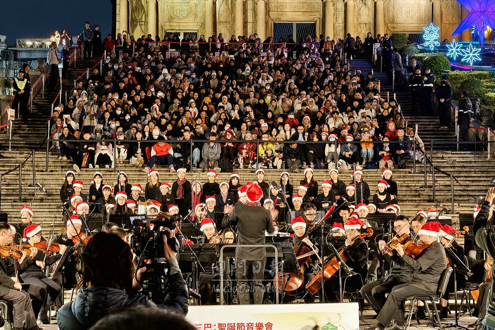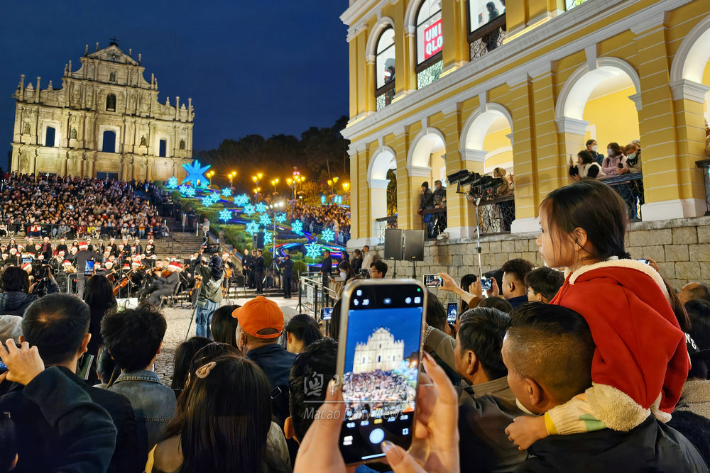 【澳門日報消息】由文化局主辦、澳門樂團有限公司承辦的“樂韻悠揚大三巴”音樂會,今晚六時及七時在大三巴牌坊舉行。澳門樂團攜手公開招募以及本澳兩所學校合唱團組成的公眾合唱團隊,演繹多首充滿節日氣氛的佳節曲目,與市民、旅客共慶佳節。不少觀眾提早到場等候,秩序良好,並即場“打卡”,拍攝精彩的演奏場面,與親友分享歡樂時刻。