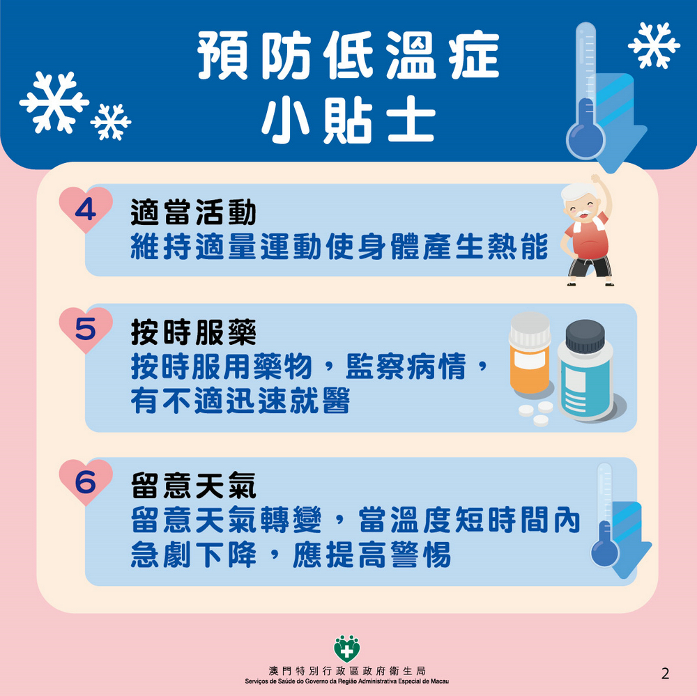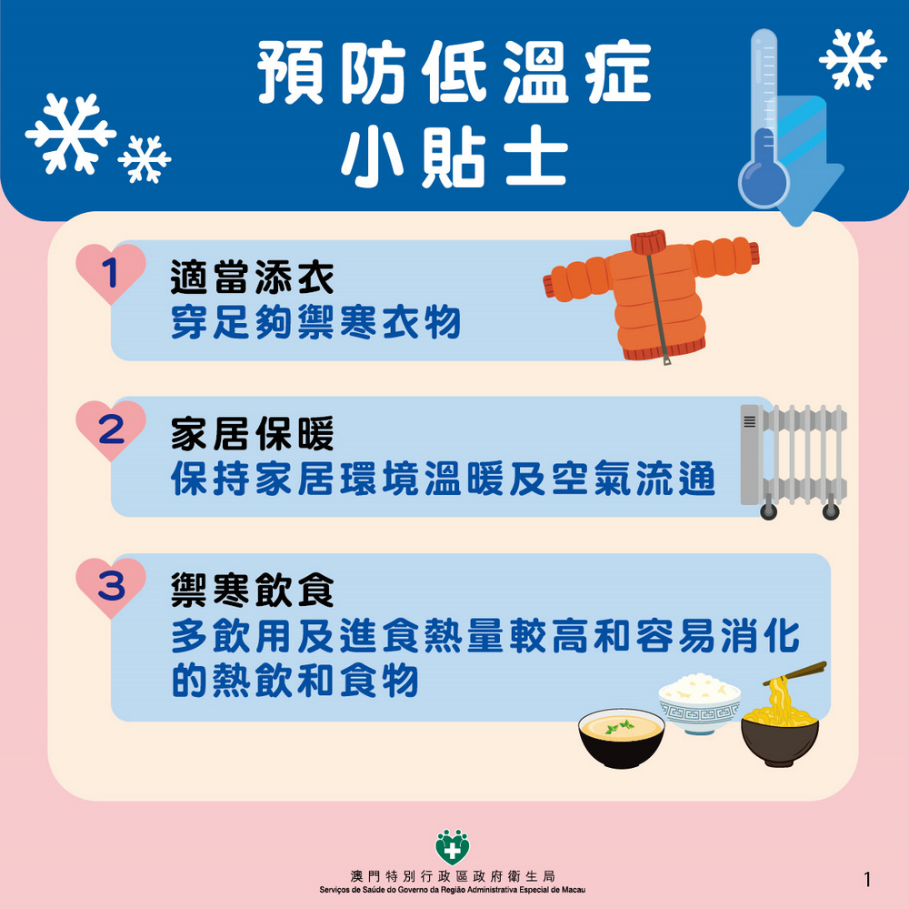 【澳門日報消息】衛生局訊:地球物理氣象局已發出黃色低溫提示,預料本澳今明(26、27)兩日天氣寒冷。衛生局特此呼籲居民預防低溫症,注重禦寒保暖。尤其是長者、慢性病患者,以及負責照護他們的人士和機構,務必採取適當的預防和照護措施,切實保障健康。 為有效預防低溫症,衛生局建議長者、慢性病患者及照護者和相關機構落實以下措施: 1、適當添衣 宜穿足夠的禦寒衣物,材質以乾爽、輕便、舒適、透氣且保暖性能良好為宜。避免穿著過於臃腫和緊身的服裝,以免影響血液循環及行動。若長者存在失禁問題,需勤換已濕的尿片和褲子。同時,要確保頭部、頸部、手部和腳部的溫暖。 2、家居保暖 保持家居環境溫暖及空氣流通,仔細檢查門窗及牆壁是否有破損,防止寒風從空隙吹入室內。使用電暖爐時,一定要保證室內空氣流通,且電暖爐要遠離門口、通道及易燃物品。對於熱力感覺減退的人士,如糖尿病及脊髓病患者,不適宜使用暖水袋、暖身器、電熱毯等。 3、禦寒飲食 多飲用及進食熱量較高和容易消化的熱飲和食物,例如熱奶、熱湯、粥、粉、麵、飯等。每天要攝取充足的水份,注意均衡營養,避免食用高脂肪及高膽固醇食物,同時要避免酗酒。切勿誤信飲酒能取暖,因為酒精會使血管擴張,飲酒後雖會短暫感覺溫暖,但隨後會加速身體熱量流失,並非保暖的好方法。 4、適當活動 盡量留在室內或有陽光的地方。若必須外出,要適當穿著保暖衣物,避免長時間處於寒冷環境或寒風中。維持適量運動可使身體產生熱能,幫助維持體溫,還能保持關節靈活,增強血液循環。 5、按時服藥 按時服用藥物,密切監測病情,一旦發現身體不適,應立即就醫。遇到緊急情況,應通過社會支援服務系統和設施盡早求助。 6、留意天氣 密切留意天氣轉變,尤其是當溫度在短時間內急劇下降時,更要提高警惕,防止因嚴寒導致體溫過低。地球物理氣象局設有24小時天氣查詢服務,電話號碼為1311。 7、關懷長者 家人和親友應關懷和協助長者,鼓勵並提醒長者作出恰當的禦寒措施。獨居或患病長者的鄰居,可經常致電或探訪關懷他們,以降低長者發生意外的機率。 居民若發現有人患上低溫症,或出現體溫持續下降、肌肉僵硬、心跳減慢、神志昏亂甚至昏迷等症狀,應盡快將患者送往醫院救治,並可撥打999(報警熱線)或2857 2222(消防局)求助。報警時說明患者當時的情況(低溫症)、年齡、性別、症狀(清醒、意識混亂、昏迷)及地址,以便救護車能迅速到達,相關醫護單位能做好適當準備。