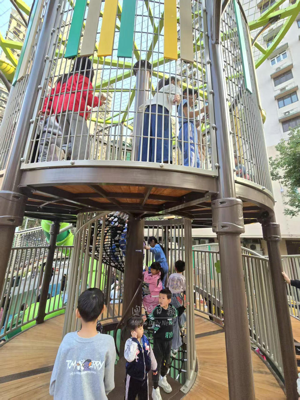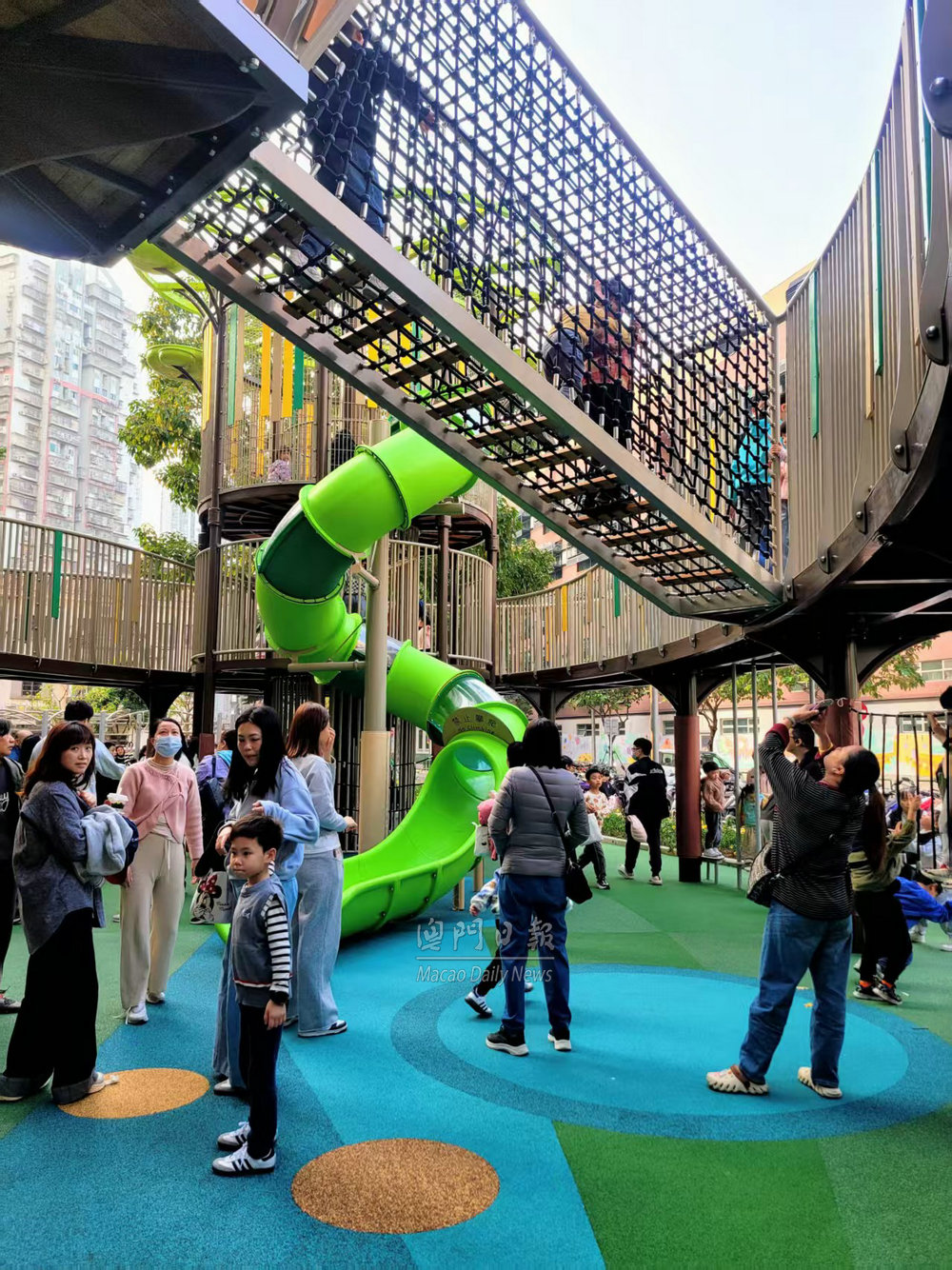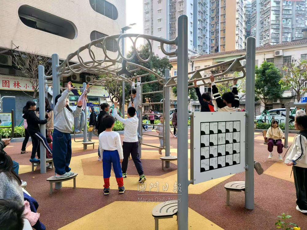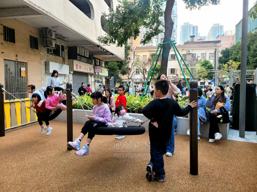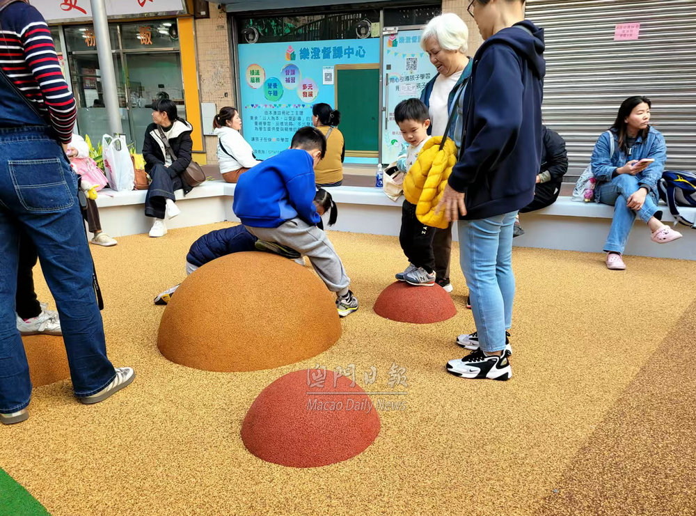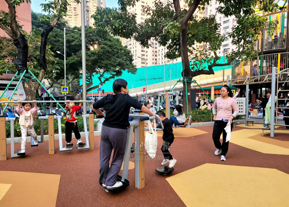 【澳門日報消息】台山中街休憩區完成優化重新開放。今日下午不少附近街坊居民與子女到場遊玩,現場十分熱鬧。 小朋友表示,休憩區外觀漂亮,大型滑梯好玩、具挑戰性。亦有長者在休憩區新增桌椅休息,與街坊閒聊。