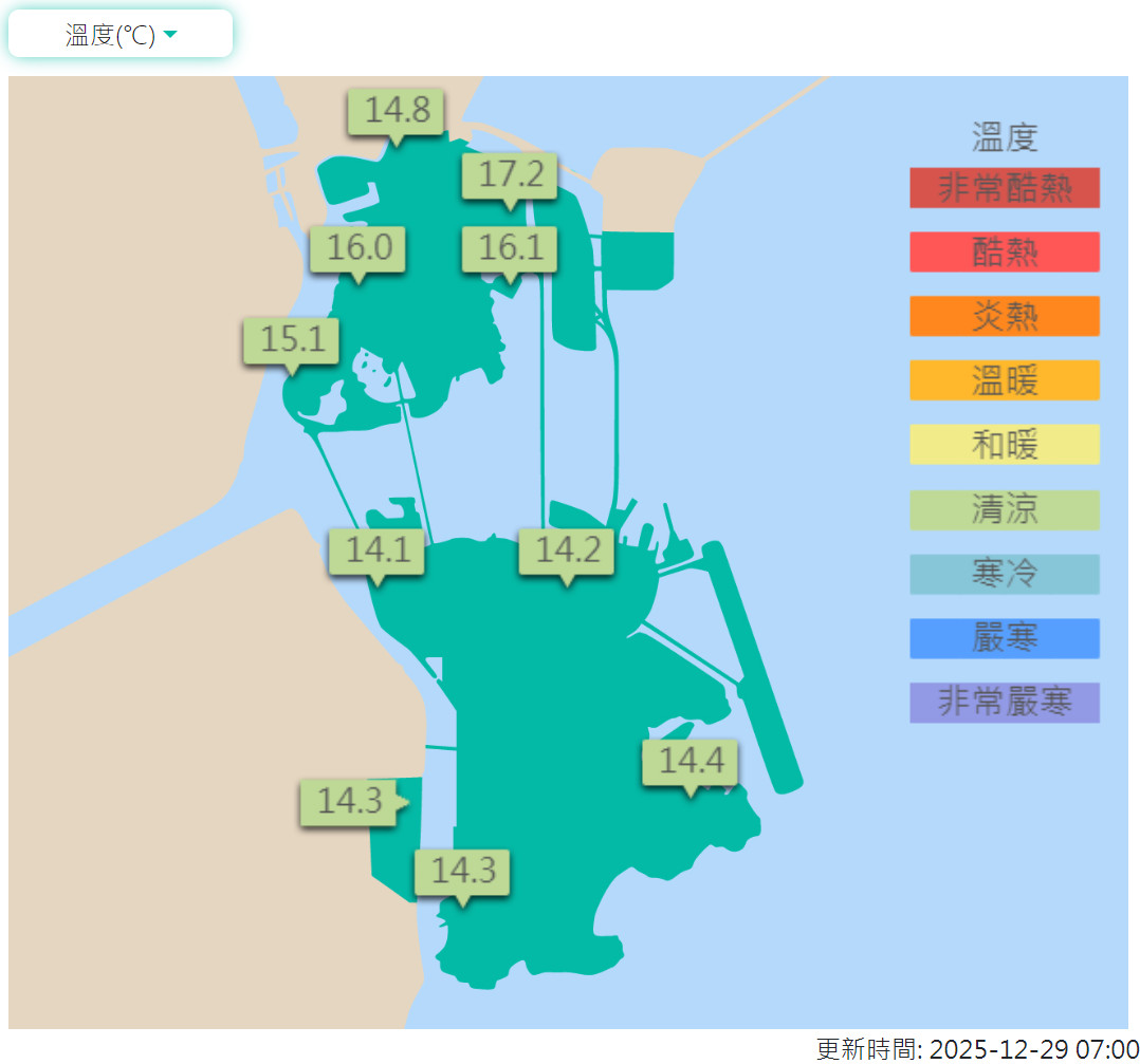 【澳門日報消息】一股東北季風正影響本澳天氣。今日大致天晴,早上有薄霧,吹微風,氣溫攝氏14至23度。相對濕度介乎50%至98%之間,預測最高紫外線指數約為5,級別屬於中等。 明日大致天晴,日間有煙霞,吹微風,氣溫攝氏14至24度,相對濕度介乎45%至90%之間。