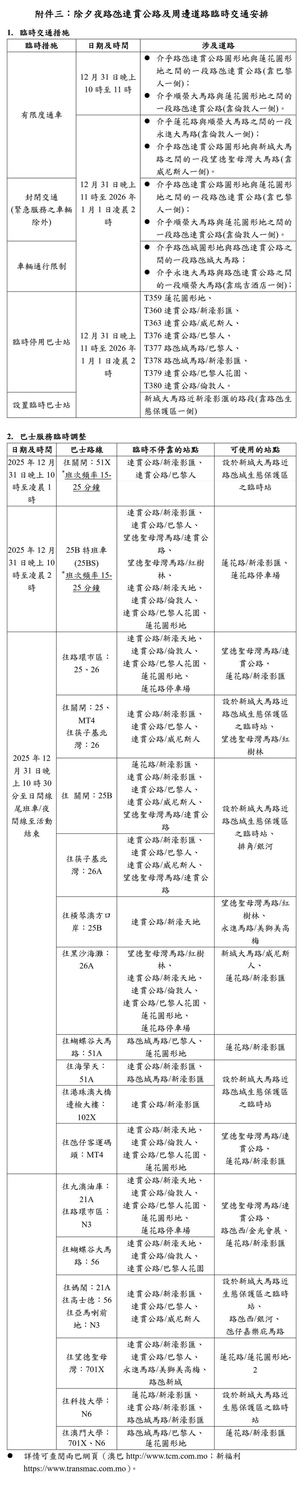 【澳門日報消息】交通局訊:除夕夜本澳各區將舉辦多項晚會、倒數活動及長跑賽事,配合活動舉辦,多處道路將實施臨時交通安排;為便利居民外出參與活動歡度新年,交通事務局已協調兩巴及輕軌公司,提前做好公交服務的臨時調整及應急方案部署,包括延長除夕夜各項公共交通的服務時間和加密班次,以及增開巴士路線特別班次等,以協助疏導人流。同時,指示巴士公司密切留意各區客流情況,適時再靈活調度班次協助分流並加派人員在主要站點維持乘車秩序。 除夕夜各項活動的主要臨時交通安排如下: 1、公共巴士21條日間路線延長服務時間至翌日凌晨1時或2時,部分夜間路線會加密班次;51X及25B特班車(25BS)路線於12月31日晚上10時至元旦日凌晨1時增開特別班次。 2、輕軌因應客流情況適時調整列車班次,並延長服務時間至元旦日凌晨2時分別開出各路線尾班車。 3、已協調各綜合旅遊休閒企業延長轄下穿梭巴士服務時間及加密班次,詳情可留意各企業最新資訊。 4、因應體育局舉辦第四回合長跑聯賽,12月31日下午5時至晚上10時,路氹網球路、溜冰路、射擊路、體育館大馬路及科技大學圓形地一帶道路臨時實施封閉交通或有限度通車,巴士臨時改道行駛及調整停靠站點。 5、因應西灣湖廣場、氹仔龍環葡韻及金光大道分別舉行除夕晚會及倒數活動,12月31晚上8時至元旦日凌晨時段,西灣湖廣場一帶、氹仔嘉模周邊道路及路氹連貫公路均會實施道路通行限制,部分巴士站點和旅遊塔的士站將臨時調整,途經的多條巴士路線改道行駛及調整停靠站點。 交通事務局建議公眾盡量使用公共交通及集體運輸工具往返活動場地,並留意最新交通資訊,提早規劃行程;輕軌公司呼籲乘客留意車站廣播信息,遵從現場標識及配合工作人員指示。