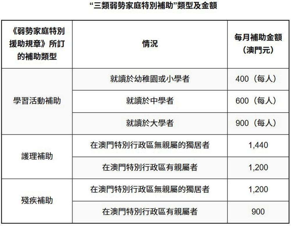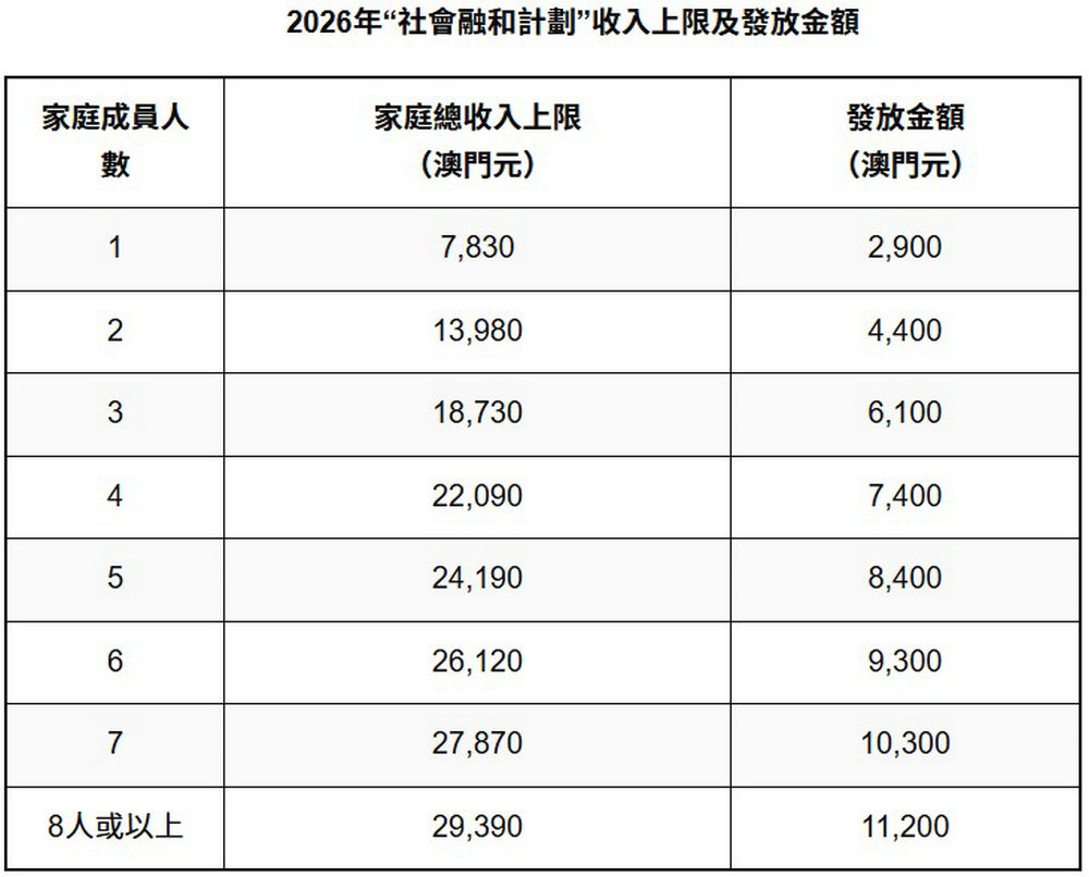 【澳門日報消息】社工局訊:特區政府積極關顧弱勢社群的生活所需,為貫徹精準扶助、資源下沉的施政方針,自2026年1月1日起,分別調升“社會融和計劃”及“三類弱勢家庭特別補助”的發放金額。 “社會融和計劃” 根據第135/2025號社會文化司司長批示,自2026年起,“社會融和計劃”向1至8人家團發放的金額調升至2,900至11,200澳門元不等。2026年度第一期“社會融和計劃”將於1月7日至2月13日期間接受申請,社會工作局經審批有關申請後,將於5月及10月向合資格的家庭發放合共兩期特別援助金。現正收取《弱勢家庭特別援助規章》三類弱勢家庭特別補助的家庭無須提出申請,可自動獲發“社會融和計劃”款項。 《弱勢家庭特別援助規章》的三類弱勢家庭特別補助 根據第136/2025號社會文化司司長批示,自2026年起,《弱勢家庭特別援助規章》所訂的三類弱勢家庭(單親、殘疾及長期病患者家庭)的特別補助金額同步調升,其中學習活動補助調升為每月400至900澳門元;護理補助調升為每月1,200至1,440澳門元;殘疾補助調升為每月900至1,200澳門元。 有關詳情可瀏覽社會工作局網頁或親臨社工局轄下各社會工作中心了解,可致電2823 4560查詢“社會融和計劃”,或致電2836 7878查詢“三類弱勢家庭特別補助”。