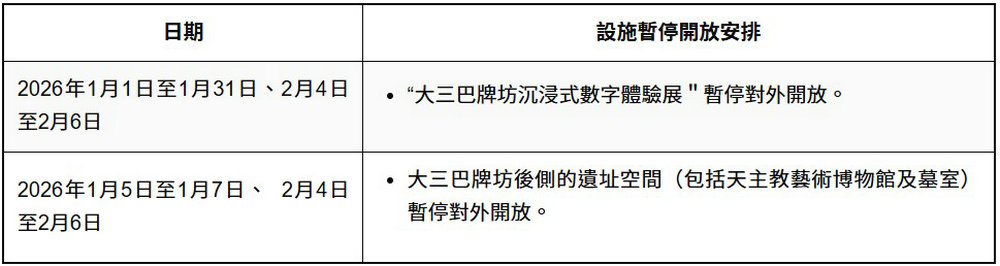 此外,為配合“大三巴牌坊沉浸式數字體驗展”設備檢查及維護,以及銅像的修復及維護保養工作,展覽將於2026年1月1日至31日、2月4日至2月6日期間暫停對外開放。查詢可於辦公時間致電2836 6320。