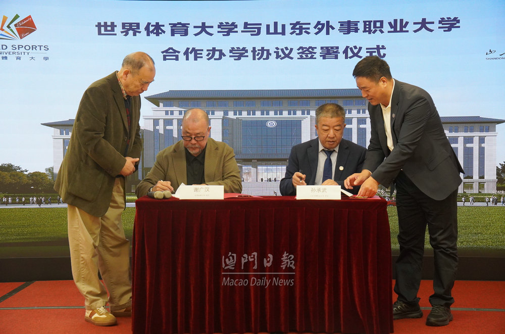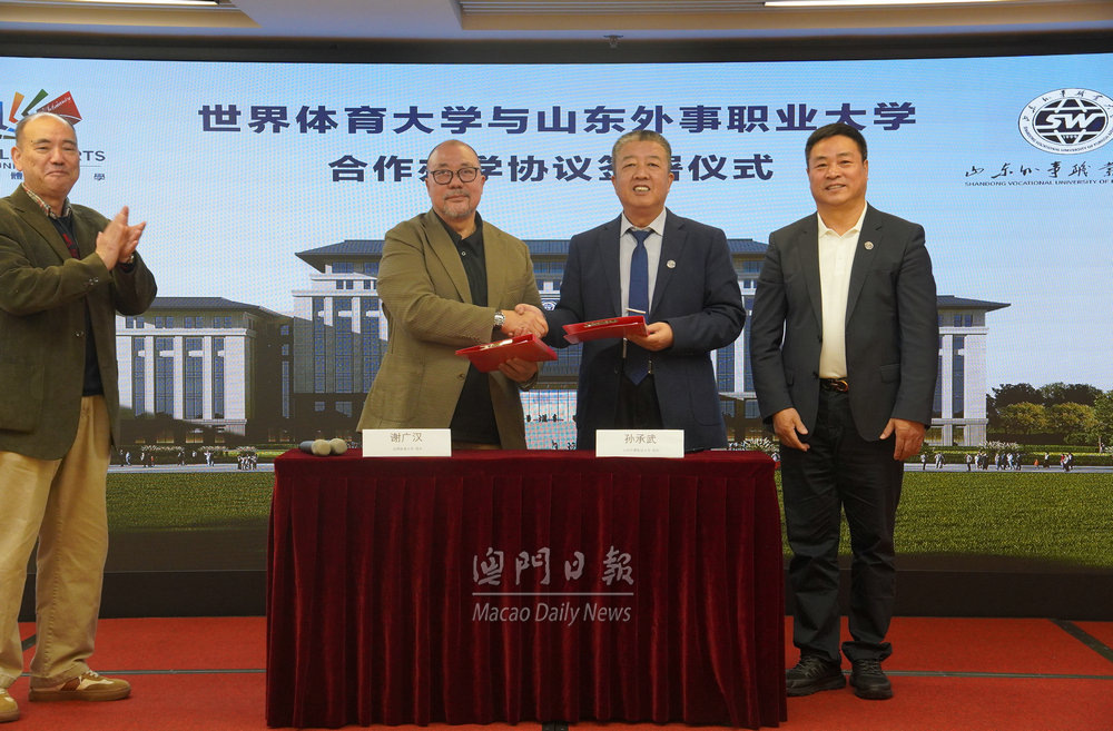 【澳門日報消息】世界體育大學今日上午十時在會址與山東外事職業大學簽署合作辦學協議,由世體大校長謝廣漢、山東外事職業大學校長孫承武代表簽署。雙方期望透過合作辦學實踐,深入探討產學研融合新模式,結合體育與教育,培養體育相關人才,促進體育產業發展。 謝廣漢透露,期望在山東外事職業大學新校區落成啟用後,雙方加大合作力度推動智力運動發展。在簽約儀式後,同場舉行體育加賦能產業升級座談會,專家學者與嘉賓暢所欲言,分享經驗。