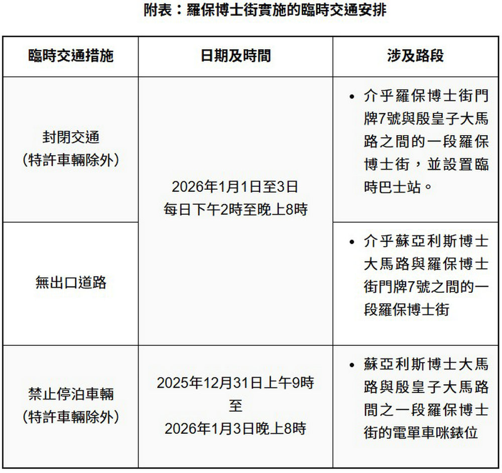 【澳門日報消息】交通局訊:為加強元旦假期乘搭巴士服務的人流疏導安排,交通事務局與巴士公司協調,於2026年1月1日至3日每日下午2時至晚上8時,對前往關閘方向的巴士停靠站點實施臨時分流安排,屆時3及3X路線將不停靠“新馬路/華僑”站,改停設於殷皇子大馬路(近羅保博士街)臨時站;為配合有關安排,羅保博士街一帶將實施臨時交通管制措施。