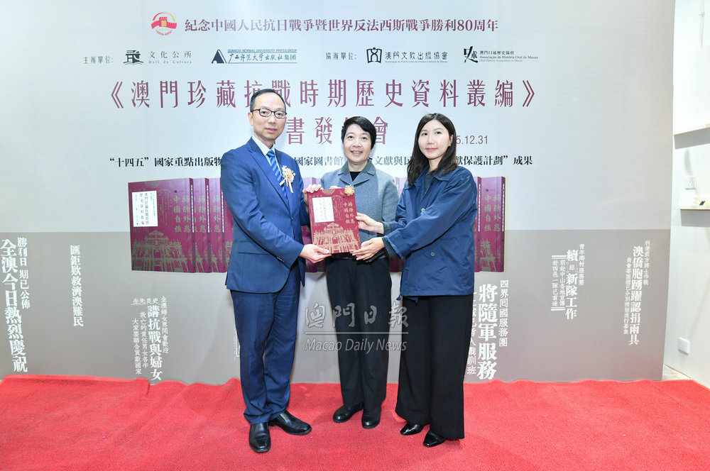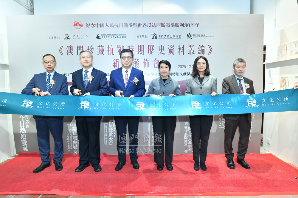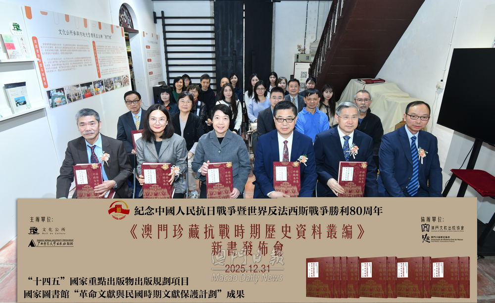【澳門日報消息】文化公所和廣西師範大學出版社今日聯合首發《澳門珍藏抗戰時期歷史資料叢編》。叢編共十冊,以一書兩號形式於內地與澳門同步發行,旨為紀念中國人民抗日戰爭暨世界反法西斯戰爭勝利八十周年。 首發儀式今日下午三時在福榮里九號文化公所舉行,社會文化司司長柯嵐代表、文化局局長梁惠敏,中聯辦宣文部部長萬速成,外交公署新聞和公共外交部副主任梁巧智,中國社會科學院中國歷史研究院澳門歷史研究中心副主任李進峰,收藏家代表羅景新,歷史學者、澳門口述歷史協會會長、澳門理工大學人文及社會科學學院院長、叢編主編林發欽主禮。 該叢書系統收錄林發欽與澳門多名資深收藏家,包括陳樹榮、羅景新、姚鴻光、尹德衛、岑偉倫、麥林、何永康、徐冠球、章寶雲、陳國賢、黃達開、鄧華開、鄭國興、譚志偉等合力整理、甄選的抗戰時期珍貴文獻與文物,是迄今最大型的澳門抗戰史料叢書,不僅為抗戰歷史研究增添重要文獻資源,更對重建澳門社會抗戰集體記憶,彰顯澳門同胞同赴國難、救亡圖存的愛國精神,具有獨特且深遠的歷史價值。 林發欽致詞表示,《澳門珍藏抗戰時期歷史資料叢編》獲列入“十四五”時期國家重點出版物出版規劃項目,並獲選為國家圖書館2023年度革命文獻與民國時期文獻整理項目,具重要的國家文化工程意義。在中國人民抗日戰爭暨世界反法西斯戰爭勝利八十周年之際公開出版,將在史料和學術上進一步確證澳門在中國人民抗日戰争不中立、不缺位的歷史事實。 廣西師範大學出版社集團總經理黃毓透過線上致詞表示,叢編的史料清晰印證著,澳門同胞始終與祖國同呼吸共命運,其中既有參加十九路軍抗日英雄,也有遭日寇暗殺的志士先賢,無數澳門兒女在民族危亡之際挺身而出,投身抗日救國浪潮,用熱血鑄就起一座座精神豐碑。叢編是一部由學者、收藏家和出版人共同守望民族歷史記憶的重大成果,是對全民族抗戰勝利的共同紀念。 澳門收藏家代表姚鴻光致詞表示,眾多收藏家樂於貢獻藏品,參與此書的出版,紙墨無言,卻承載著民族記憶與精神根脈。期望這套叢書能成為薪火之種,啟迪當代,傳承後世,讓澳門愛國情懷與歷史智慧永續流傳。