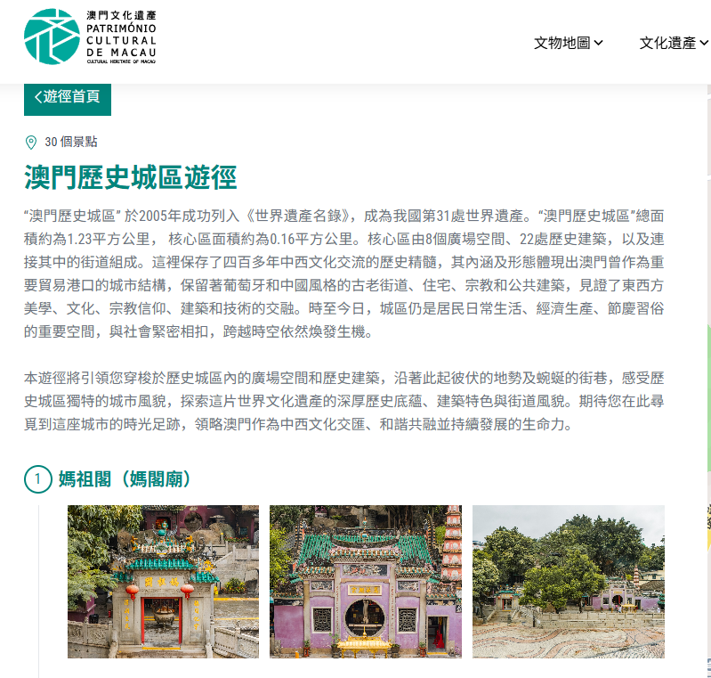 專題網頁圖文並茂,以視頻導覽、語音導賞及互動地圖等方式,為市民和旅客提供便捷與豐富的線上導賞及實地文化探索體驗。除上述新增的遊徑外,公眾亦可透過專題網頁查閱“澳門海上絲綢之路史跡遊徑”及“中西文化交匯的教育歷史建築遊徑”兩條主題遊徑路線。文化局未來將持續深挖本澳歷史資源,分階段推出更多主題路線,豐富專題網頁內容,推動公眾認識與體驗澳門歷史文化。查詢可於辦公時間致電2836 6320。