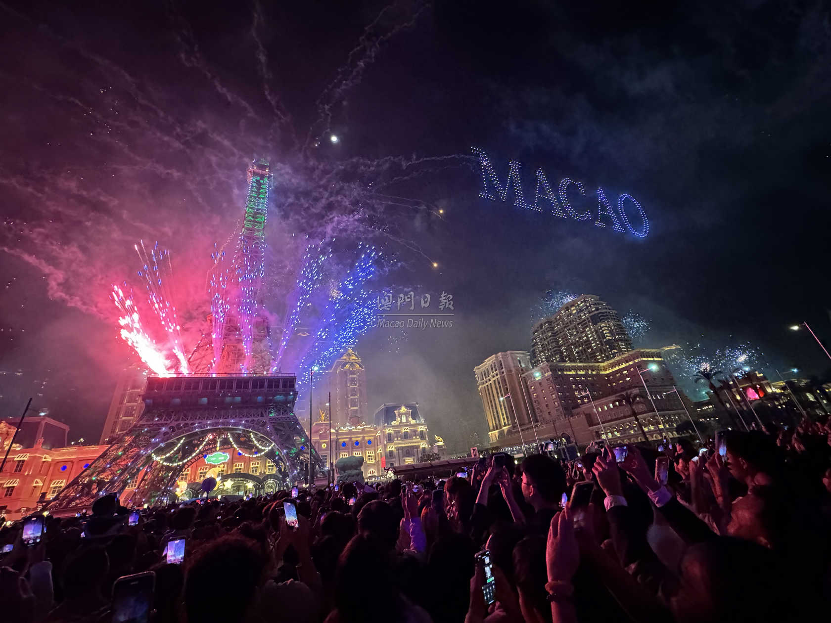 【澳門日報消息】除夕夜,路氹金光大道舉行本澳跨年煙花活動,現場不少居民旅客提早到場霸佔有利位置。踏入2026年鐘聲敲響之際,一場長達八分鐘的煙花匯演,閃亮金光大道。
