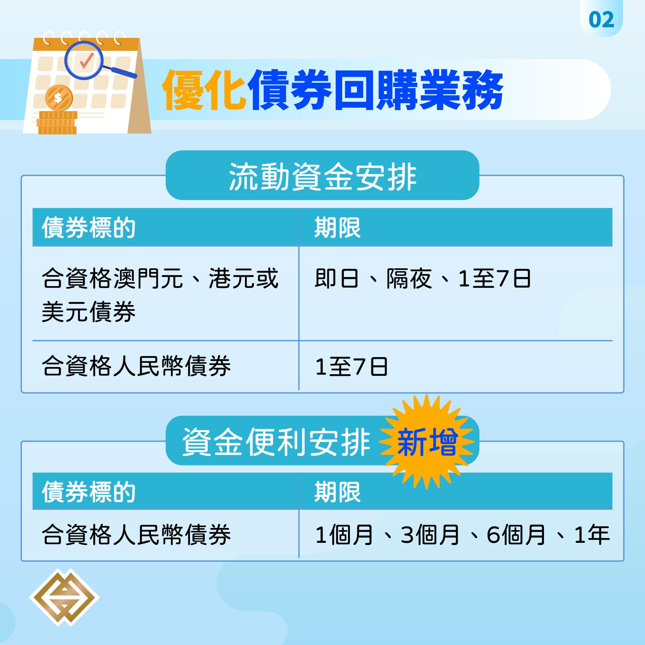 【澳門日報消息】在《中國人民銀行與澳門金融管理局人民幣/澳門元常備互換協議》規模擴大至500億元人民幣或570億澳門元的基礎上,澳門金融管理局於今日起推出經優化的債券回購業務,以及加設專項人民幣掉期,充分把握中央政府給予澳門的政策支持,並推動業界善用貨幣互換機制與資金管理工具,優化流動性管理。 金管局於2023年初推出債券回購業務,以合資格債券作為回購標的,向本地銀行提供澳門元和人民幣的流動資金。為支持本地貨幣市場及債券市場發展,債券回購業務於即日起新增較長期限的“人民幣資金便利安排”;與此同時,本地銀行可利用澳門“中央證券託管系統”(CSD)與香港“債務工具中央結算系統”(CMU)直接聯網機制下的合資格債券進行回購業務,進一步發揮兩地聯動和協同發展效應。 此外,為豐富本地銀行取得人民幣資金的渠道,金管局於即日加設以港元或美元敍造的專項人民幣掉期,以增加本澳離岸人民幣市場的流動性,促進本地金融市場人民幣業務的穩健發展。 為讓業界更好地了解業務流程,金管局與澳門中央證券託管結算一人有限公司(MCSD)於日前舉辦“債券回購及專項人民幣掉期”業務線上講解會,共30多家本地銀行參與。未來,金管局將繼續透過各項金融工具進行貨幣市場操作,維持澳門貨幣金融體系穩定,促進現代金融產業提質發展。 更多詳情可瀏覽金管局新增的“貨幣管理工具”專頁。