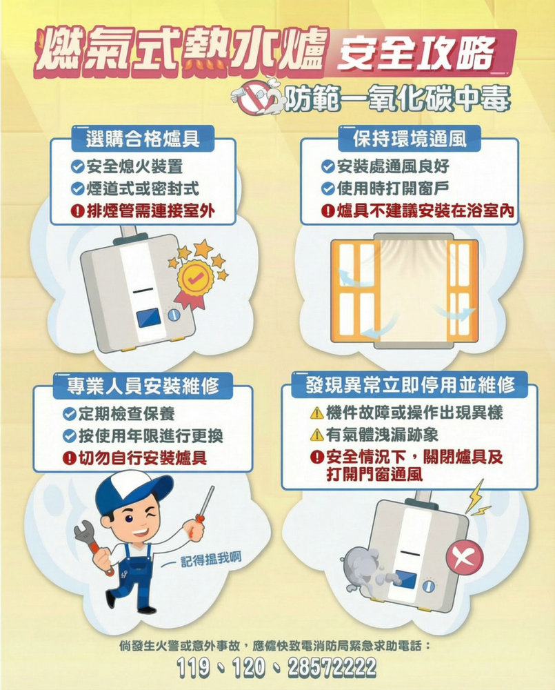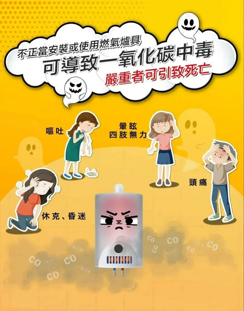 消防局提醒,一氧化碳無色、無味、無嗅,中毒者有可能在不自覺的情況下進入昏睡,最後身體因嚴重缺氧而死亡。市民一旦懷疑自己、家人或身邊人士吸入一氧化碳中毒,應盡量保持冷靜,立刻打開門窗增加空氣流通,將懷疑中毒人士移至通風良好的環境,且在安全情況下立即撥打緊急電話或就近求助。