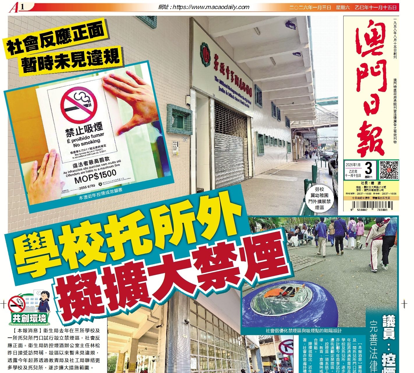 【澳聞頭條】學校托所外擬擴大禁煙 【要聞頭條】國防部:隨時回擊謀“獨”挑釁 【經濟頭條】露天茶座助攻 餐廳假期客流增15% 【體育頭條】氹坊取“聖”出線