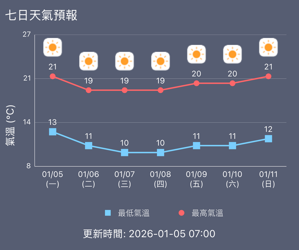周五(9日)天氣寒冷及極為乾燥,天晴,11至20度。周六(10日)天氣寒冷及極為乾燥,天晴,11至20度。周日(11日)天氣寒冷及乾燥,大致天晴,12至21度。