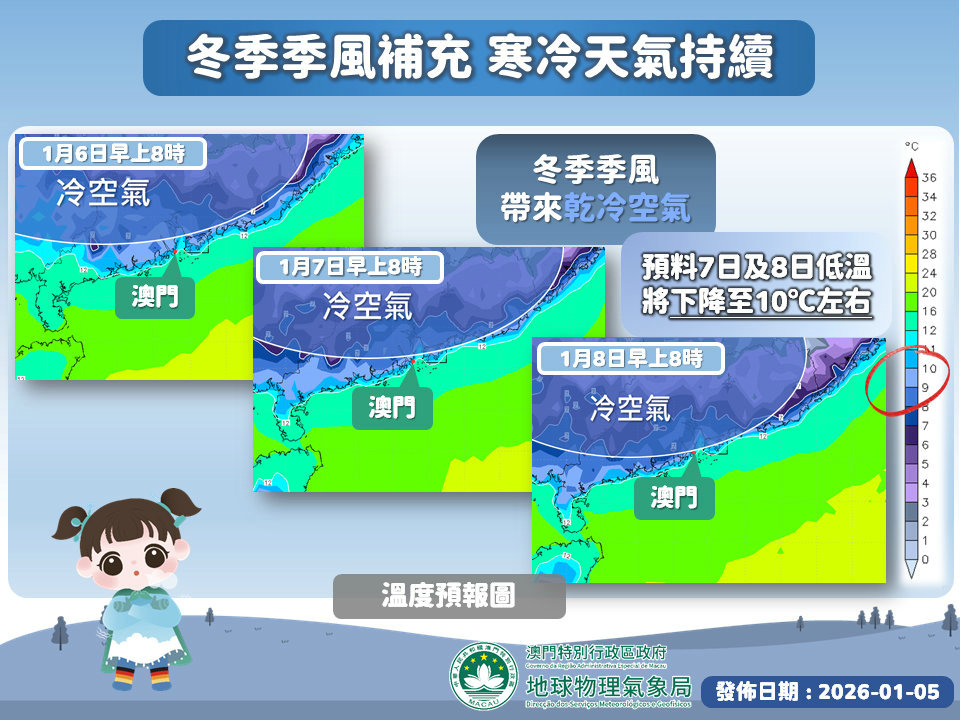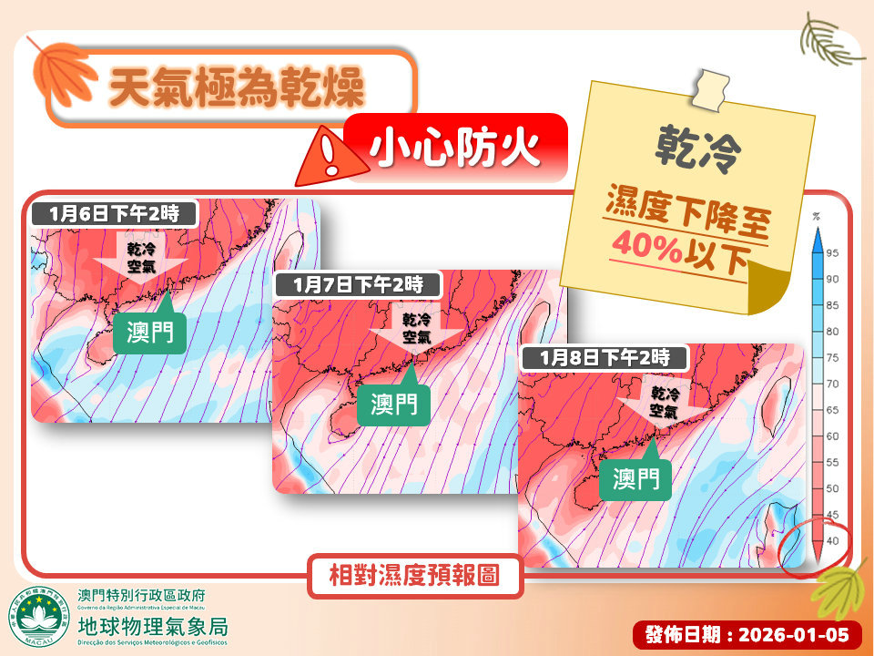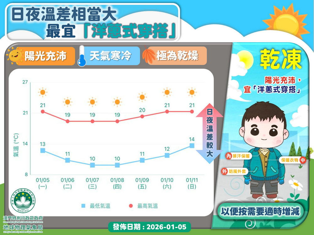 【澳門日報消息】新年伊始,本澳天氣持續寒冷,周六(3日)更錄得入冬以來最低溫9.8度。隨著冬季季風稍為緩和,今日(5日)氣溫略為回升,但寒冷天氣仍未完結,未來一周天氣又會有咩變化呢?氣象局發文釋疑。 寒冷天氣持續 預料一股冬季季風補充將於今日(5日)晚間抵達廣東沿岸,本澳氣溫將再度下降至寒冷水平,本周中後期(7日及8日)的最低氣溫將降至10度左右,且不排除更低。然而,由於日間陽光充沛,日夜溫差會相當大,屬典型“乾凍”天氣。 注意保暖防火 由於該冬季季風將伴隨相當乾燥的大陸性氣流,受其影響,本澳天氣將變得極為乾燥,相對濕度將下降至百分之四十以下。天乾物燥,市民需注意保暖及補充水份,並務必增強防火意識,杜絕火災隱患。 宜洋蔥式穿搭 預料本周“乾凍”天氣將會持續,由於早晚寒冷,但日間陽光充沛,這種日夜溫差較大的天氣,最適宜洋蔥式穿搭,即穿搭兼顧排汗、保暖、防風的多件式衣物,並因應天氣狀況適時增減。