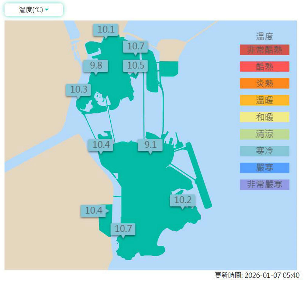 【澳門日報消息】一股冬季季風正影響本澳天氣。今日天氣寒冷及極為乾燥,天晴,吹4至5級偏北風,間中6級及有陣風,氣溫攝氏9至17度。相對濕度介乎百分之25至65之間,預測最高紫外線指數約為6,級別屬於高。 氣象局已發出黃色低溫提示,預料本澳未來數日天氣持續寒冷,市民適當添衣,注意保暖。 明日天氣寒冷及極為乾燥,天晴,吹3至4級北至東北風,氣溫攝氏9至18度,相對濕度介乎百分之20至60之間。