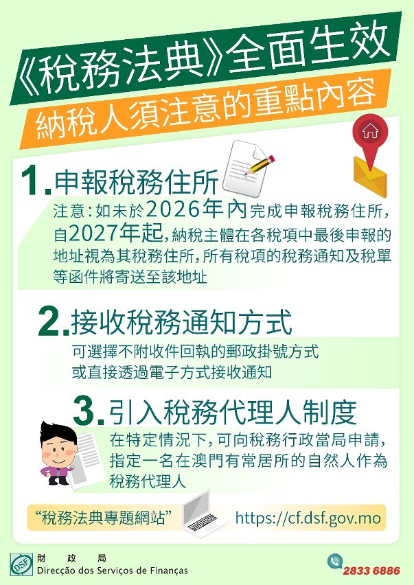 【澳門日報消息】財政局訊:第24/2024號法律核准《稅務法典》自本月1日起全面生效。該法典整合本澳現行多項稅務法律,並建立與國際稅收標準接軌的現代稅務制度,包括明確屬地稅收原則、引入轉讓定價規則及稅務代理人制度,以及清晰界定稅務法律關係中各方的權利與義務等,標誌本澳稅務體系邁向新階段。