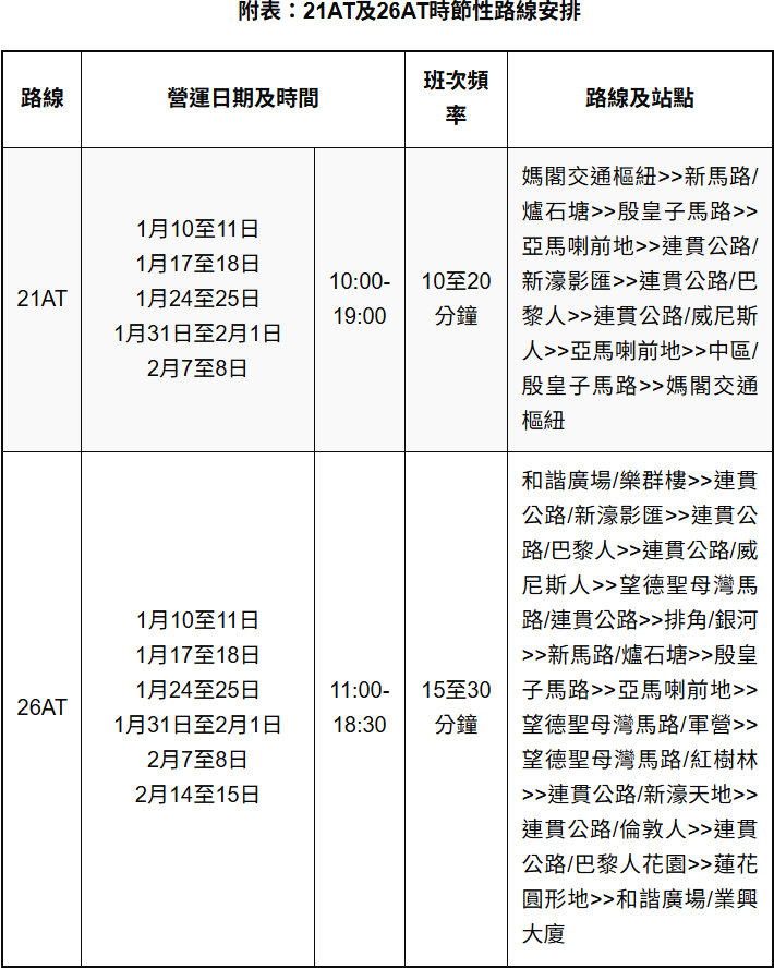 【澳門日報消息】因應農曆新年將至,交通事務局經評估往年同期及近期客況,預計近期周末中區新馬路及路氹城一帶的乘車需求將有所增加,為加快疏導乘客,與兩巴協調,21AT及26AT時節性路線由本月10日起至農曆新年前、逢周六日指定時段營運,詳情可查閱下表及兩巴網頁。 交通事務局會密切留意有關路線的運作情況及整體客流,亦已開展農曆新年期間各項臨時交通安排的部署工作,詳情將於適時公佈。