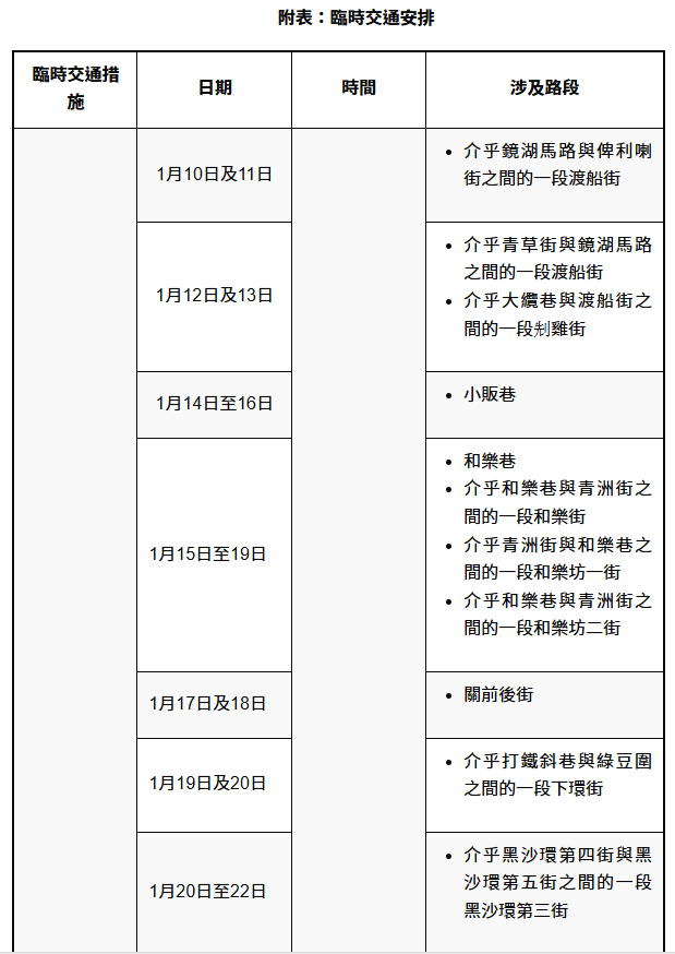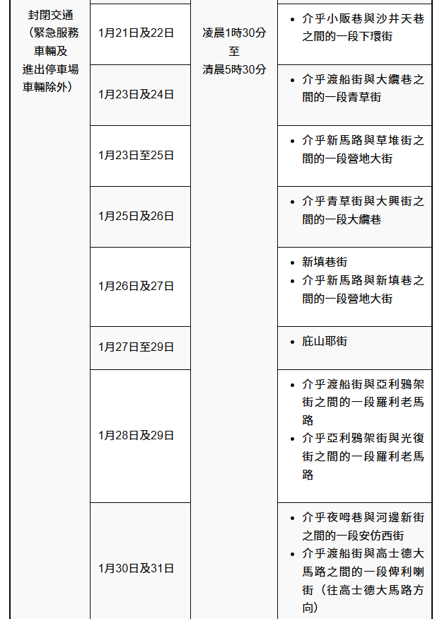 【澳門日報消息】配合市政署疏通排水管道工作,1月10日至31日期間,每日凌晨1時30分至清晨5時30分,本澳多處道路將分階段實施封閉交通,詳情可查閱附表。
