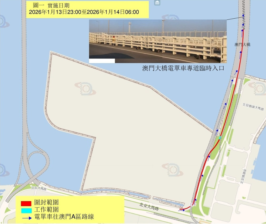 一、本月13日晚上11時至翌日清晨6時,氹仔北安往澳門A區的電單車引橋將臨時封閉,電單車駕駛者可經北安大馬路使用澳門大橋私家車車道上橋後,再駛入電單車專道前往澳門A區。