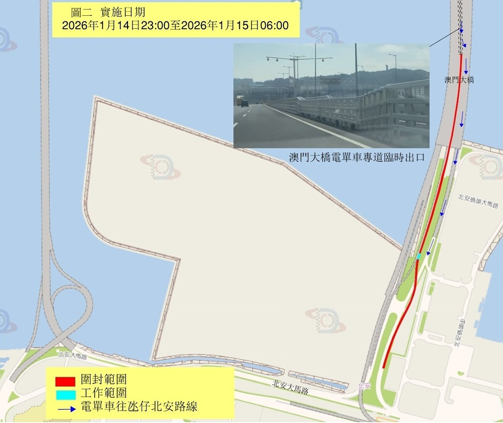 二、本月14日晚上11時至翌日上午6時,澳門A區往氹仔的電單車道氹仔出口將臨時封閉,電單車駕駛者可於電單車專道道近氹仔端的一段位置駛入私家車車道前往氹仔。