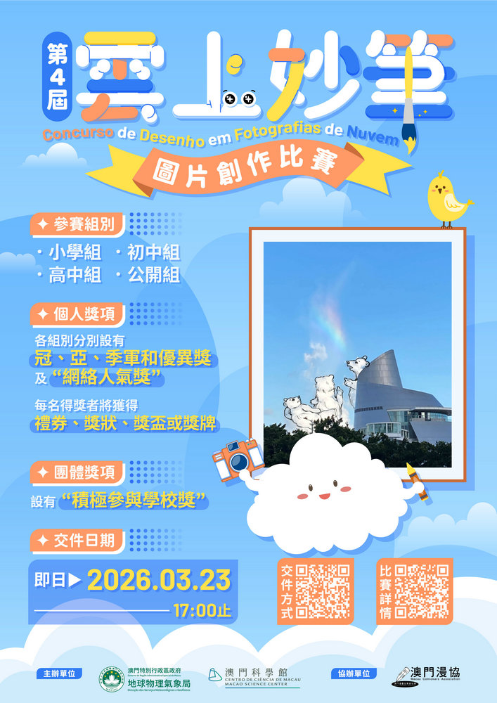 【澳門日報消息】氣象局訊:為推動氣象科普教育,地球物理氣象局聯同澳門科學館合辦、澳門漫畫從業員協會協辦的第四屆“雲上妙筆圖片創作比賽”,由即日起至3月23日接受報名,冀提升公眾對天氣情況的關注和認識,以及對雲種等氣象知識的了解。