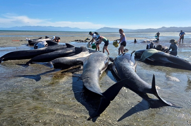 【澳門日報消息】綜合新西蘭傳媒報道,當地時間8日,55頭領航鯨在新西蘭南島北端的費爾韋爾沙咀海灘擱淺,其中6頭死亡。 當地迅速組織近200人救援,自發組成人鏈助鯨魚脫困。經過多天解救,至10日仍有15頭領航鯨擱淺,其餘30餘頭順利遊回深海。 領航鯨有強烈的社會性,如果一頭領航鯨游入淺水區,鯨群內的其他成員便會緊隨其後,形成集體擱淺。