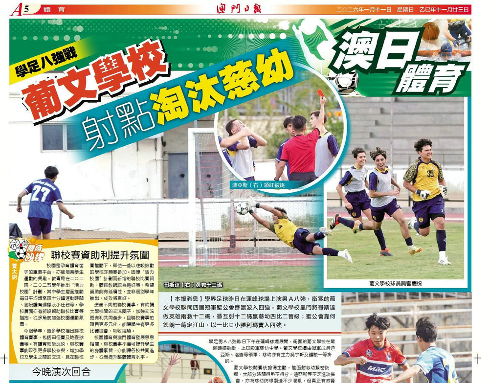 葡文學校射點淘汰慈幼 聯校賽資助利提升氛圍 澳籃戰廣東再爭粵澳盃 朱雨玲八強撼王藝迪 足總召開會員大會