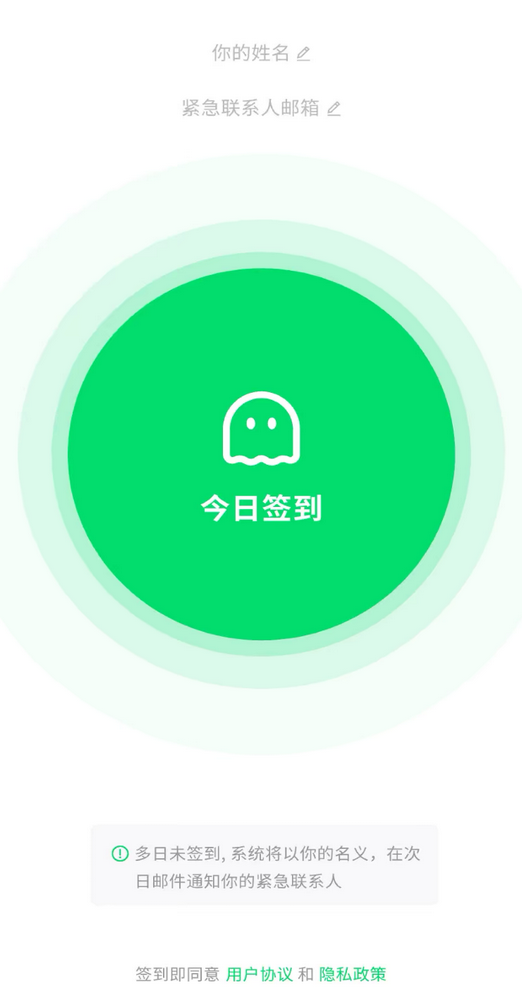 該軟件上周四(8日)推出,須付費八元人民幣下載,無需註冊登錄,首次使用要填寫本人姓名與緊急聯繫人郵箱,打開APP便可一鍵簽到。倘若用戶連續兩天無在APP內簽到,系統將於次日自動發送郵件告知緊急聯繫人。